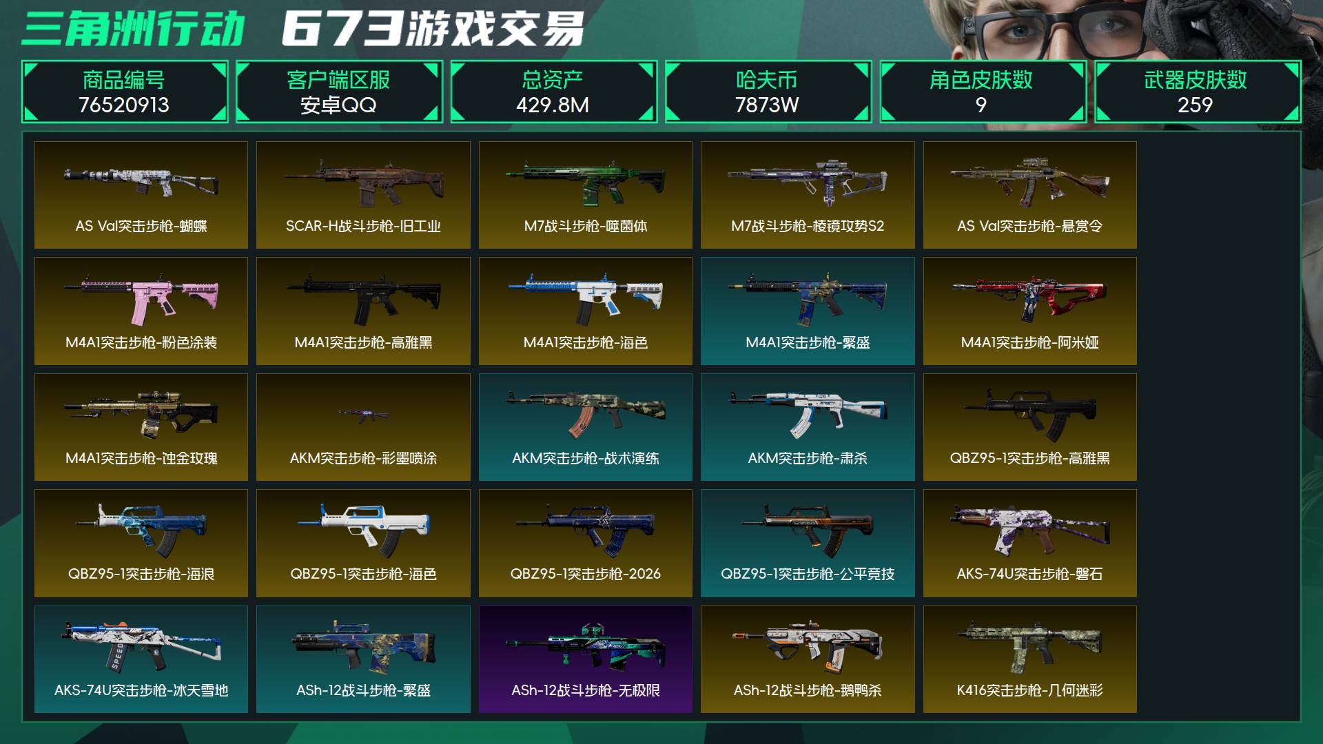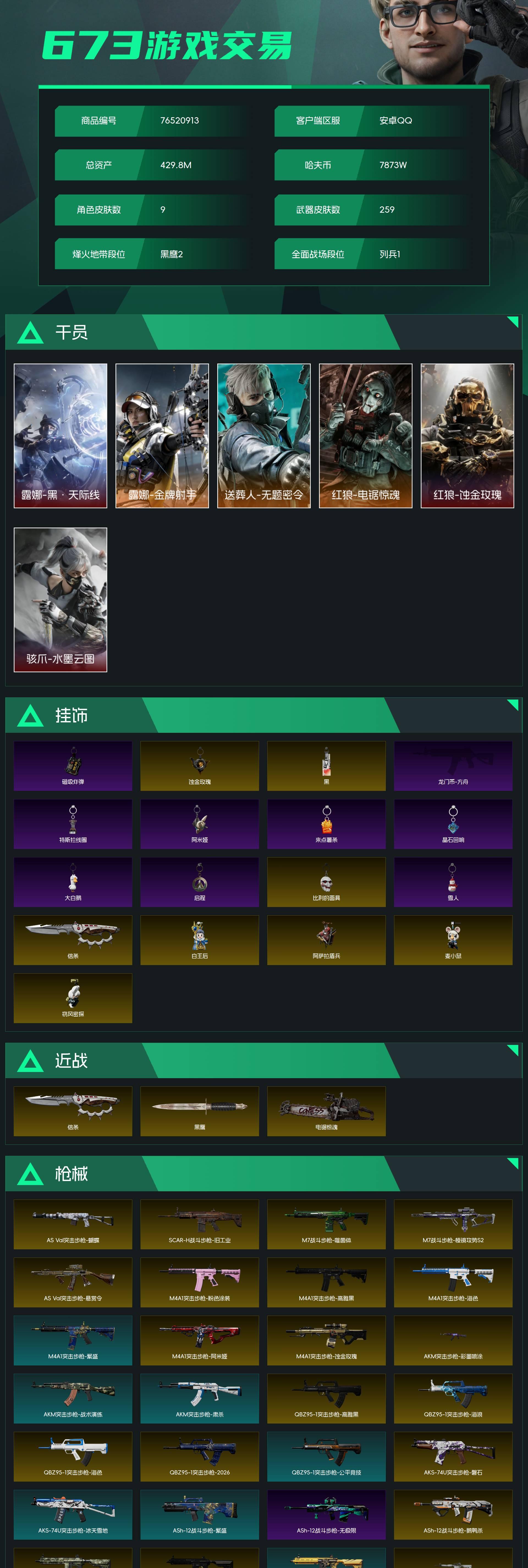 烽火段位黑鹰2 战场段位列兵1 总资产429.8M 哈夫币7873W 干员9 挂饰29 近战5 枪械