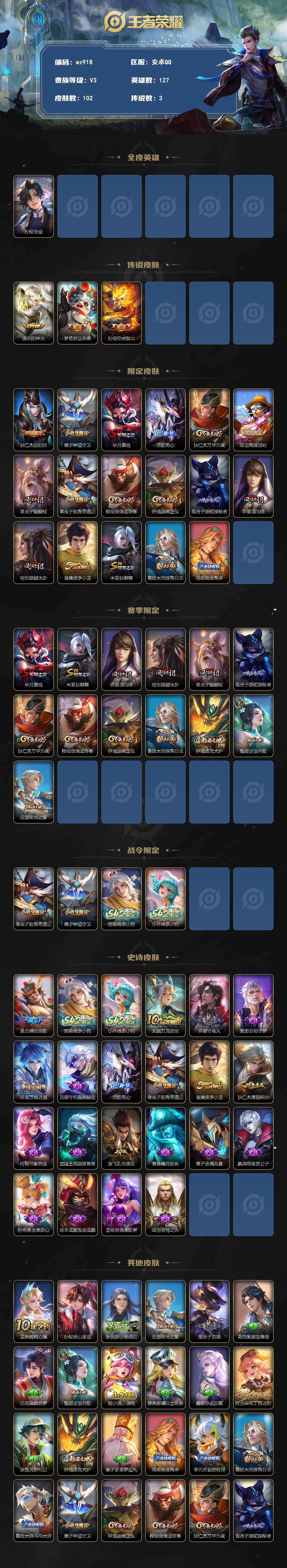 安卓Q-V3-尊贵铂金I段位-127英雄-102皮肤-3传说-21史诗【英雄
