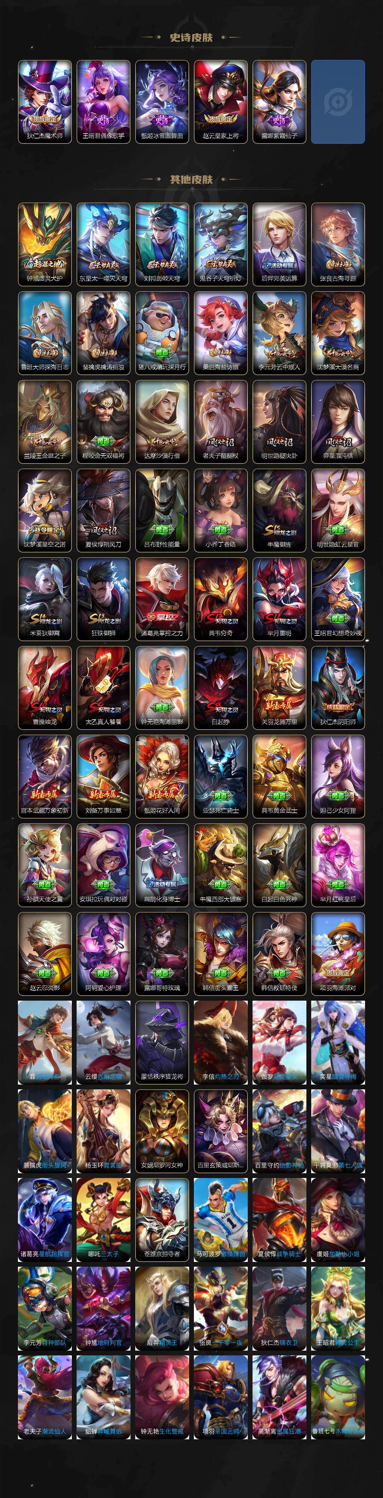 【限定皮肤】:白起狰,狄仁杰阴阳师,赵云皇家上将,芈月重明,夏侯惇朔风刀,曹操烛龙,典韦穷奇,狄仁杰魔术师,达摩沙漠行僧,项羽海滩派对,老夫子醍醐杖,韩信飞衡,兰陵王金庭之子,牛魔御旌,后羿辉光之辰,李元芳银河之约