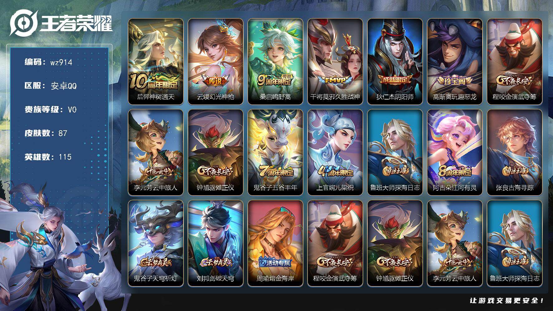 安卓Q-V0-永恒钻石IV段位-115英雄-87皮肤-4传说-23史诗