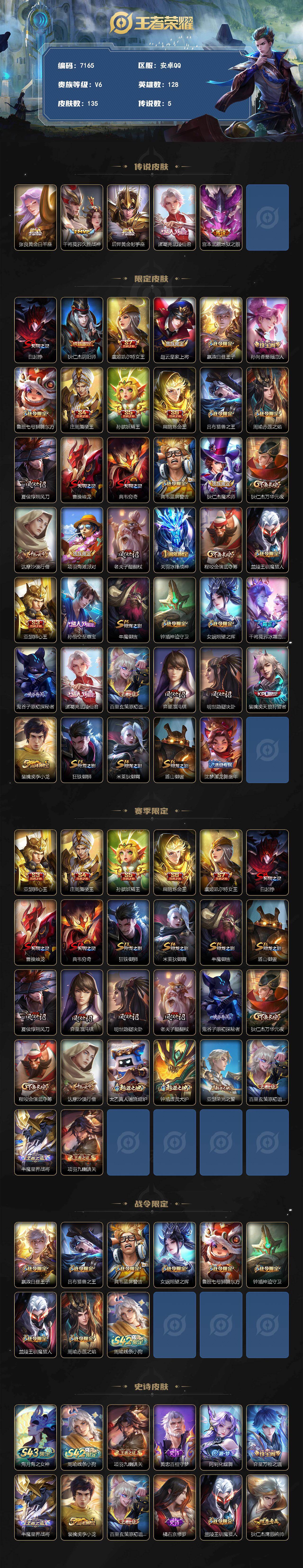 贵族6-135皮0典藏5传说 金标高渐离 安卓手Q103区135皮0典藏5传