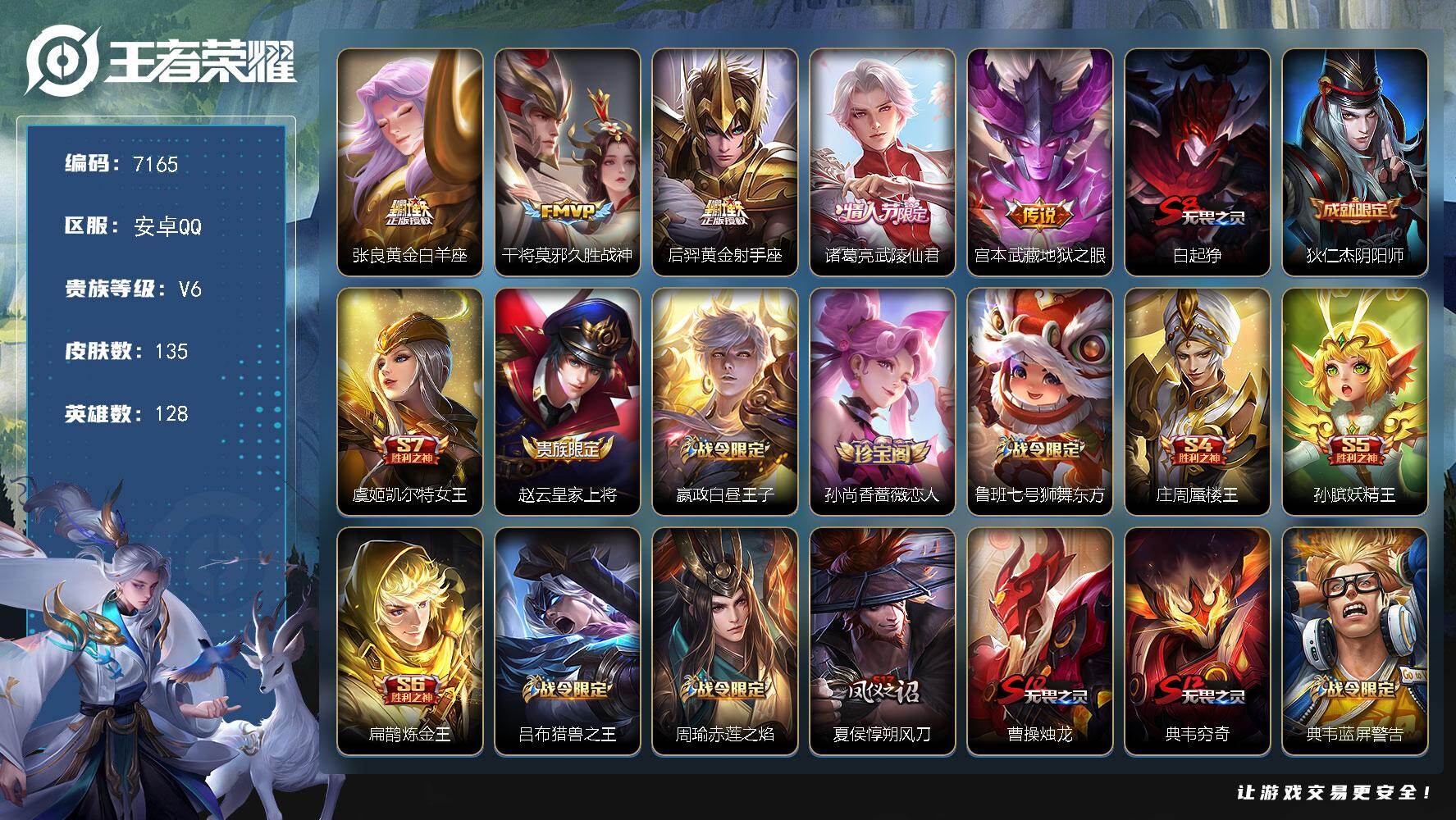 贵族6-135皮0典藏5传说 金标高渐离 安卓手Q103区135皮0典藏5传说0无双V6
