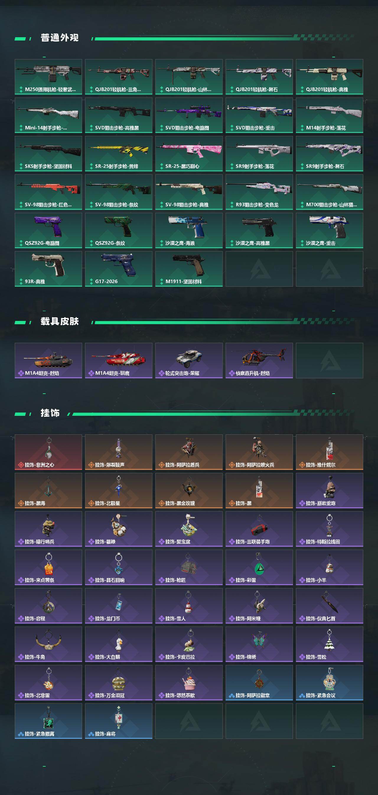 【传说外观】:M4A1突击步枪-蚀金玫瑰,M4A1突击步枪-阿米娅,AKM突击步枪-锦绣,ASh-12战斗步枪-鹅鸭杀,AUG突击步枪-悠然茶歇,SG552突击步枪-运动员