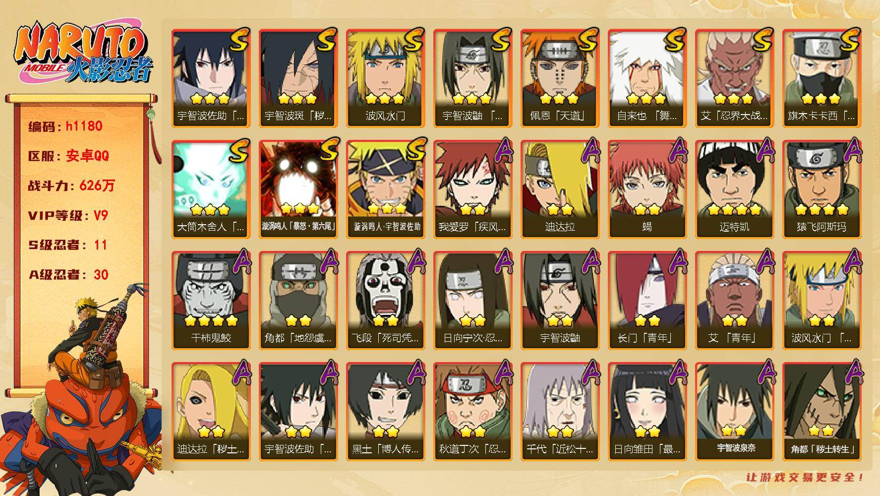 11S级忍者数-30A级忍者数【S级忍者】:宇智波斑「秽土转生·解」(3星),艾「忍界大战」(3星),宇智波鼬「须佐能乎」(3星),旗木卡卡西「须佐能乎」(3星),自来也「舞之豪杰」(3星),波风水门(3星),佩恩「天道」(3星),宇智波佐助「永恒万花筒」(3星),大筒木舍人「最终章」(3星),漩涡鸣人「暴怒·第六尾」(3星),漩涡鸣人·宇智波佐助(3星)【A级忍者】:艾「青年」(2星),长门「青年」(2星),波风水门「青年」(2星),迪达拉(2星),迪达拉「秽土转生」(2星),飞段「死司凭血」
