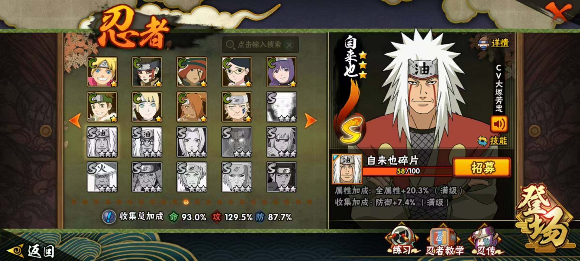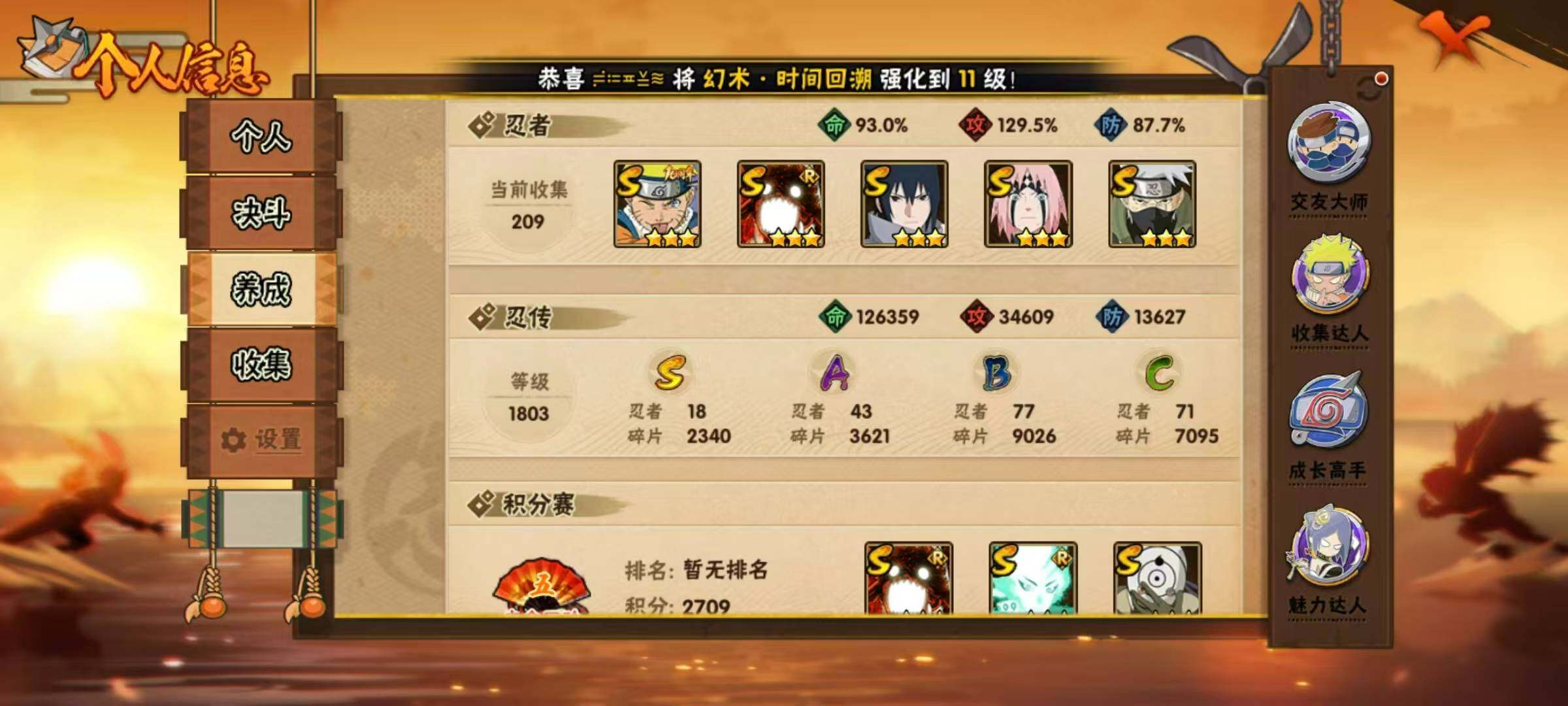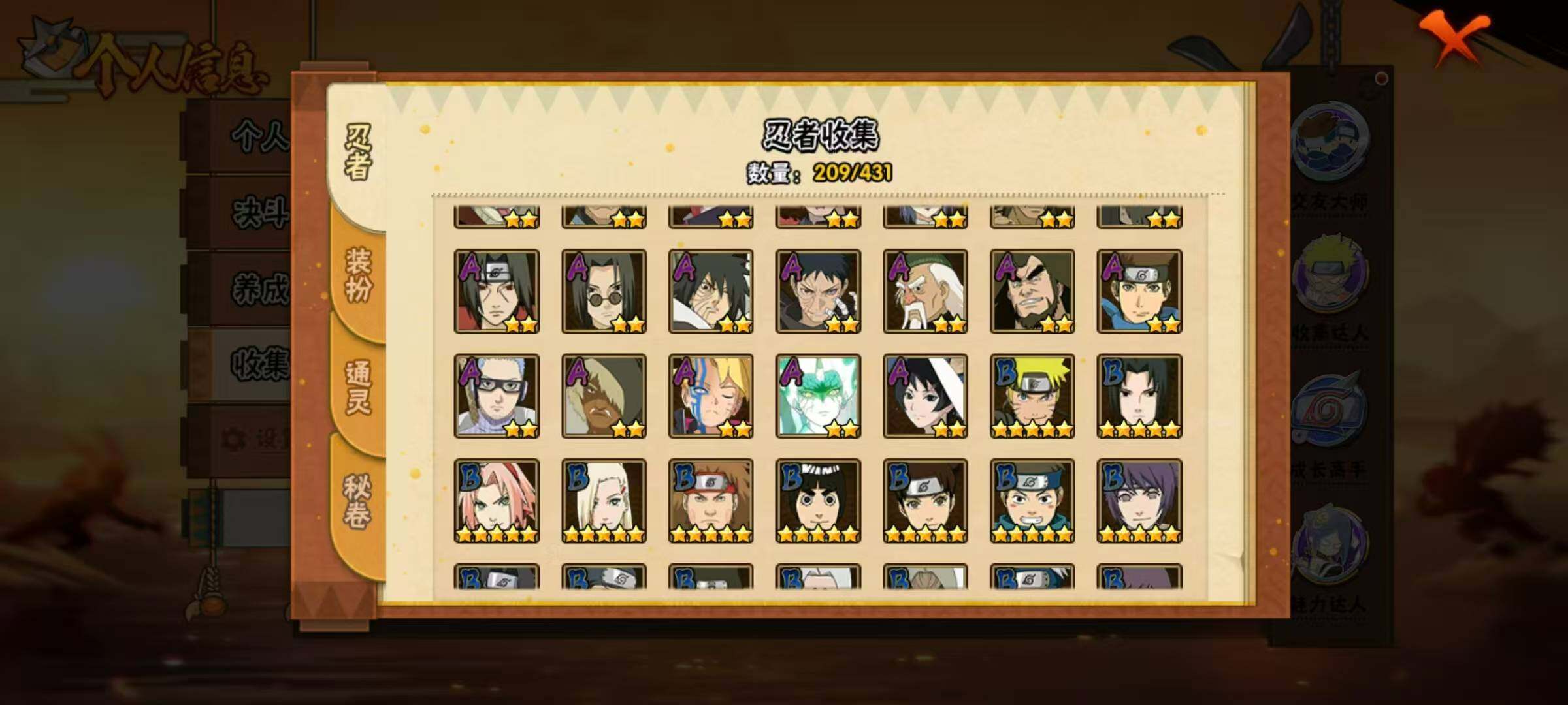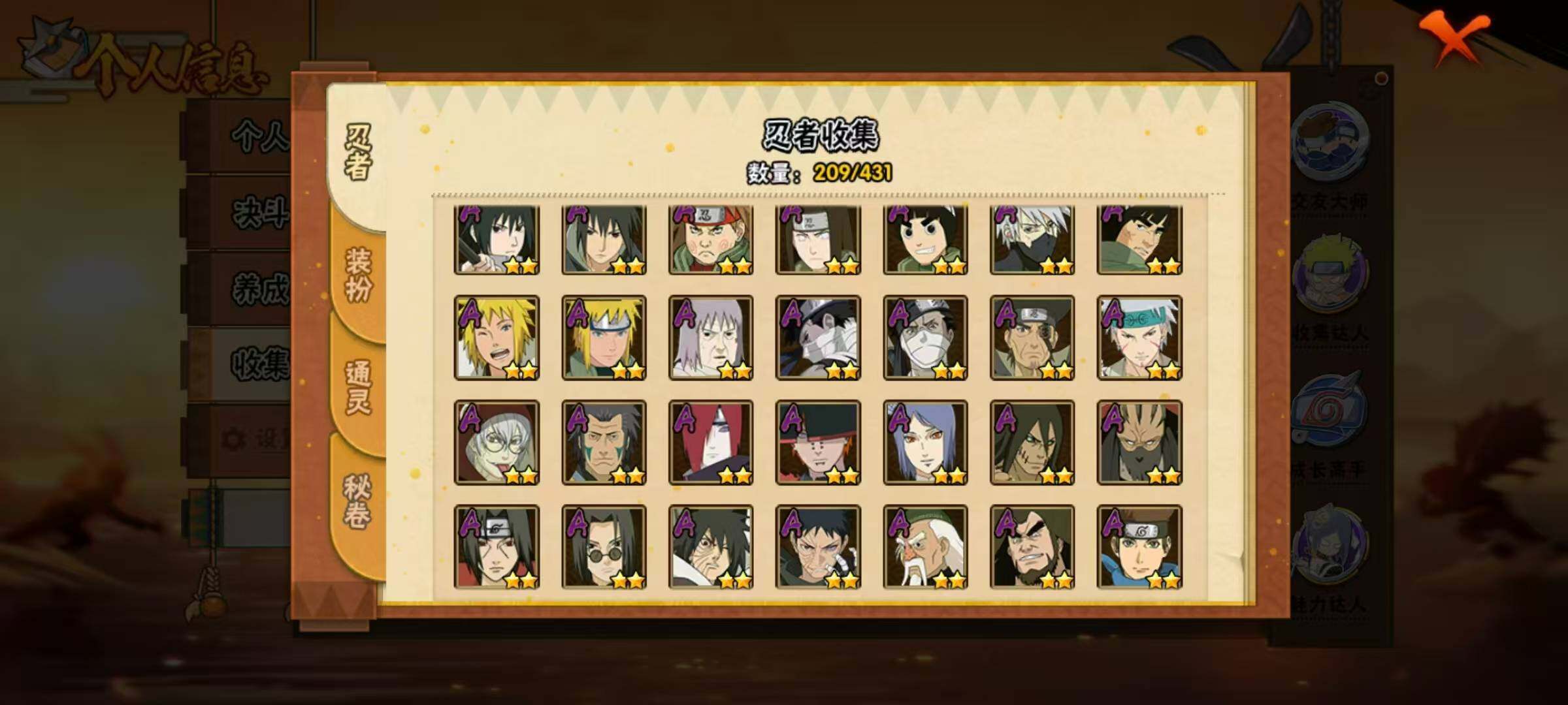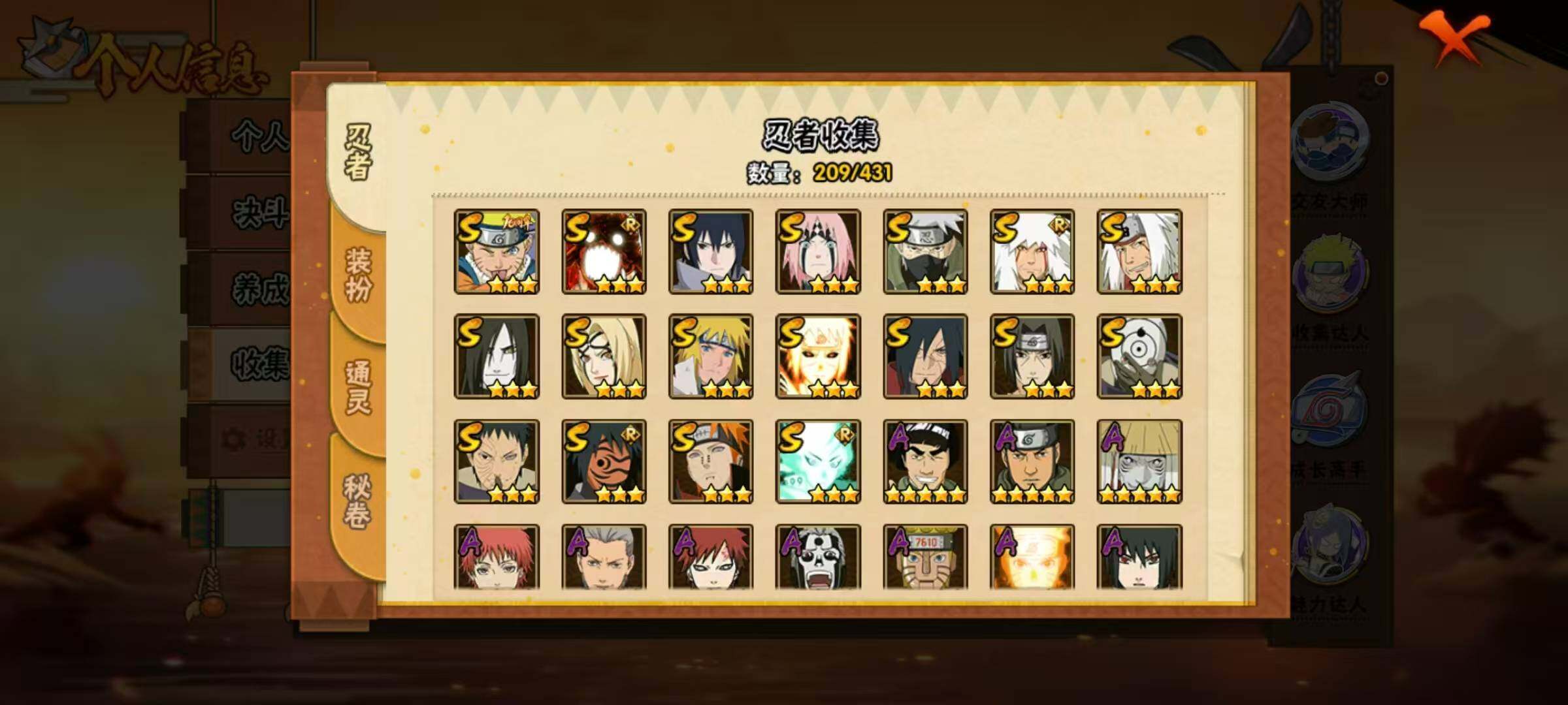 18S级忍者数-43A级忍者数【S级忍者】:宇智波斑「秽土转生·解」(3星),春野樱「忍界大战」(3星),宇智波带土「忍界大战」(3星),宇智波鼬「须佐能乎」(3星),旗木卡卡西「须佐能乎」(3星),自来也「舞之豪杰」(3星),大蛇丸(3星),自来也「传说中的三忍」(3星),纲手「百豪」(3星),波风水门(3星),神秘面具男「红夜之刃」(3星),佩恩「天道」(3星),宇智波佐助「永恒万花筒」(3星),宇智波斑 「白面具」(3星宇智波斑「白面具」),大筒木舍人「最终章」(3星),漩涡鸣人「暴怒·第