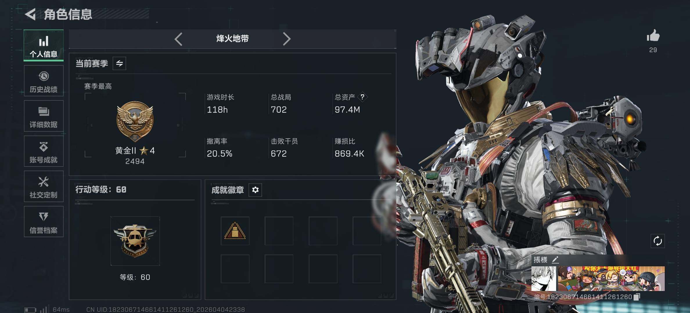 97m总资产-20620k哈夫币-60烽火等级-黄金-25战场等级-军士长【