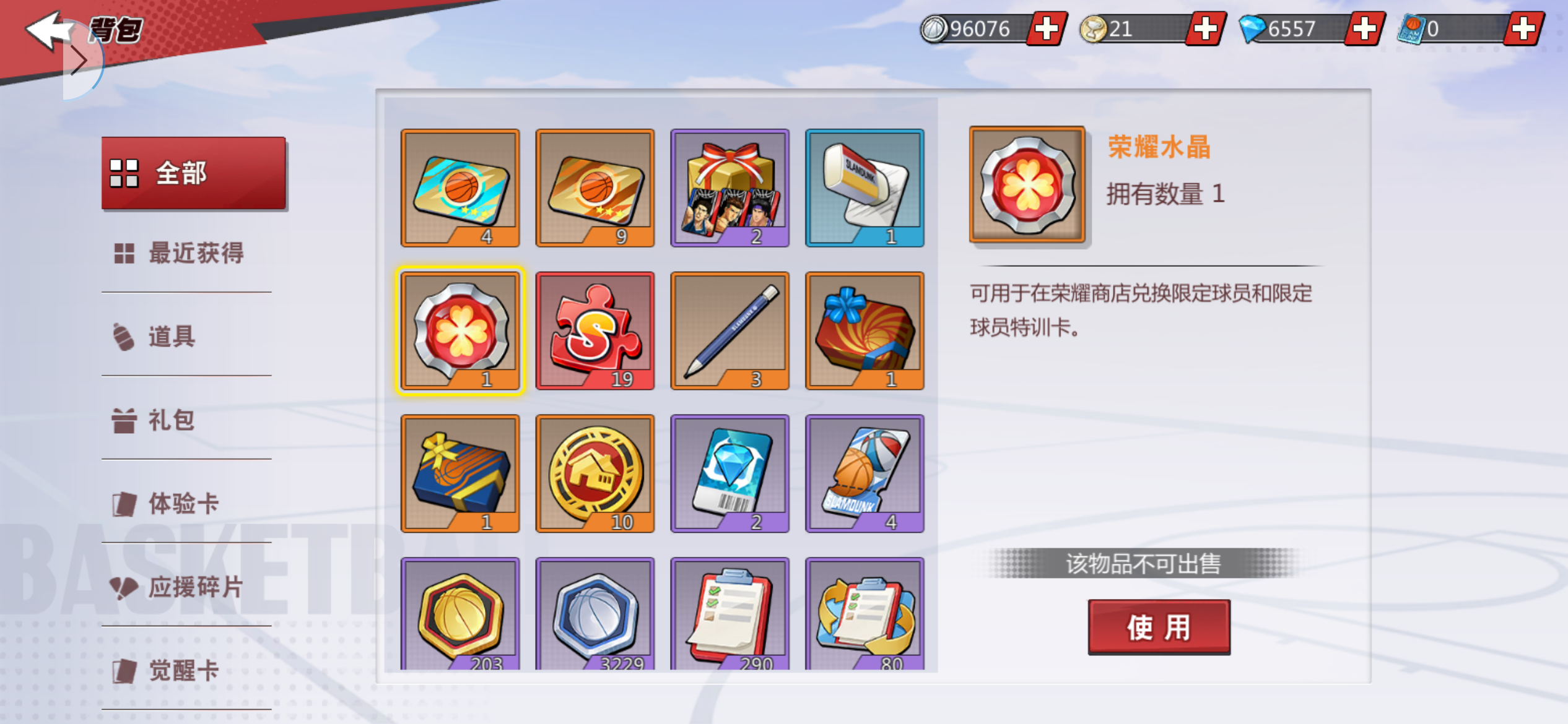 荣耀水晶一颗 湘北队服箱1个 翔阳队服箱3个 在售期间正常保养