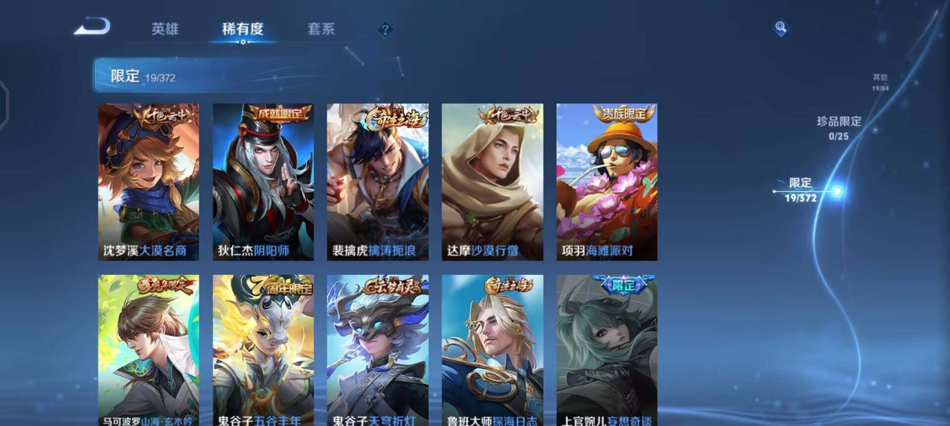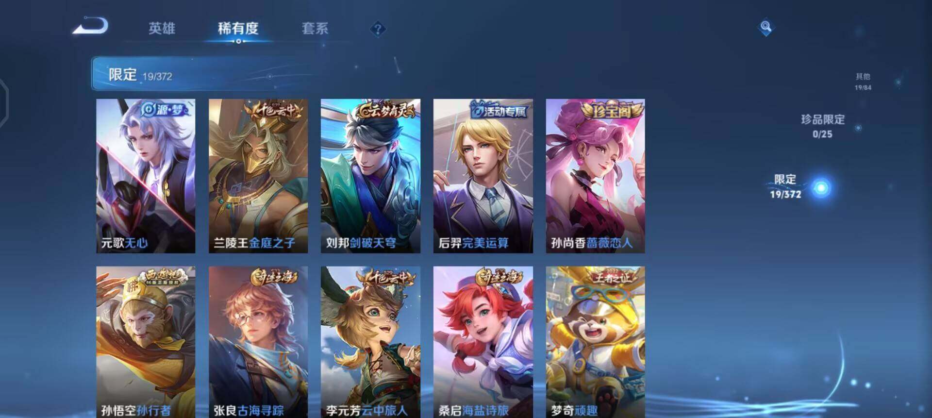 【限定皮肤】:狄仁杰阴阳师,孙尚香蔷薇恋人,元歌无心,马可波罗山海玄木吟,达摩沙漠行僧,项羽海滩派对,兰陵王金庭之子,孙悟空孙行者,李元芳云中旅人,鬼谷子五谷丰年,