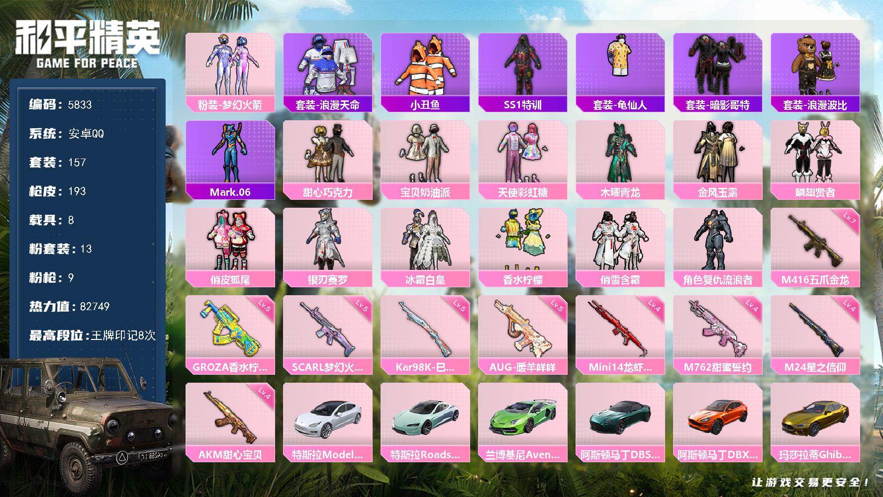 眼罩满级地铁安卓 手Q-13粉装-9特效枪-8载具-3粉色飞行器-82749热力值-8王牌印记-157套装-193枪皮