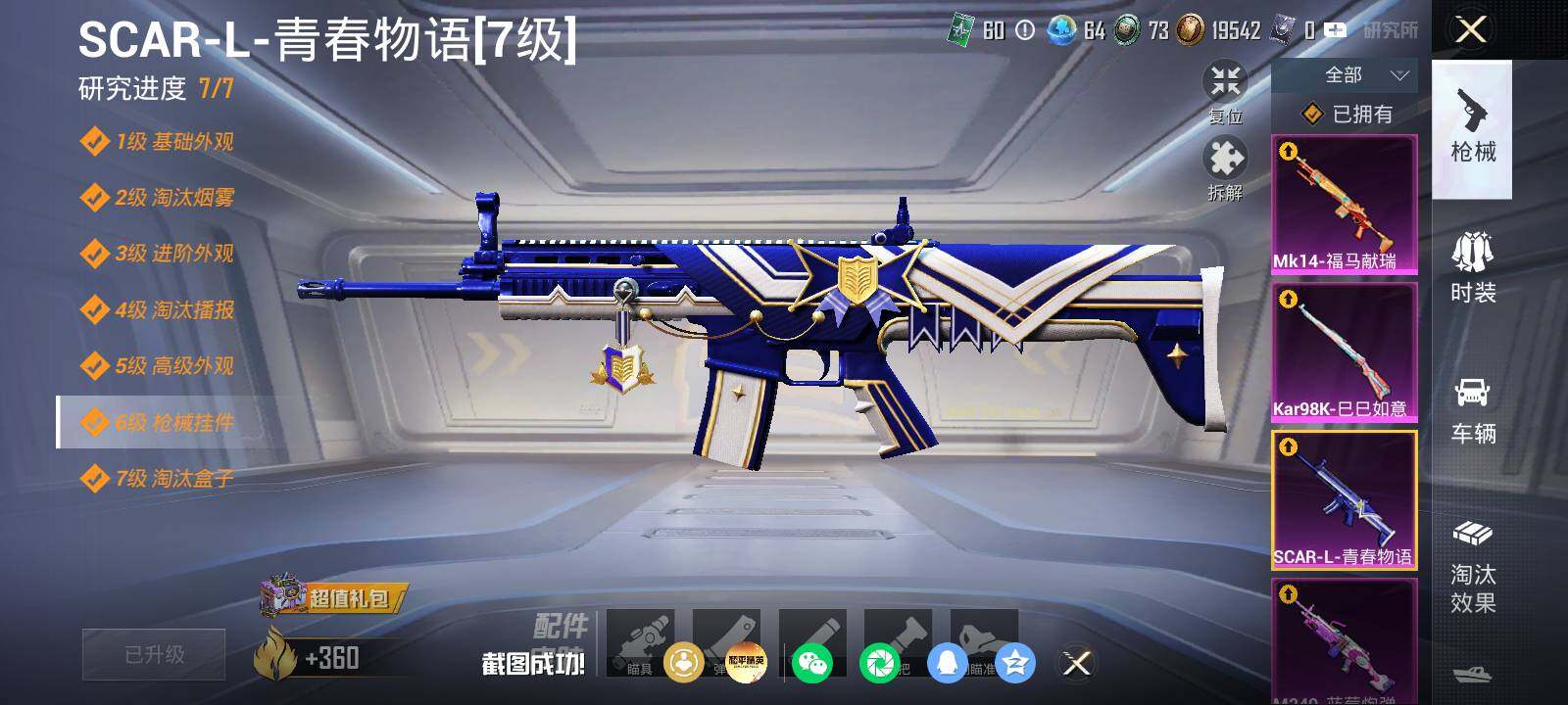 【粉色枪皮等级】:SCAR-L-青春物语(七级),Kar98K-巳巳如意(五级),Mk14-福马献瑞(四级),M249-蓝莓炮弹(七级)