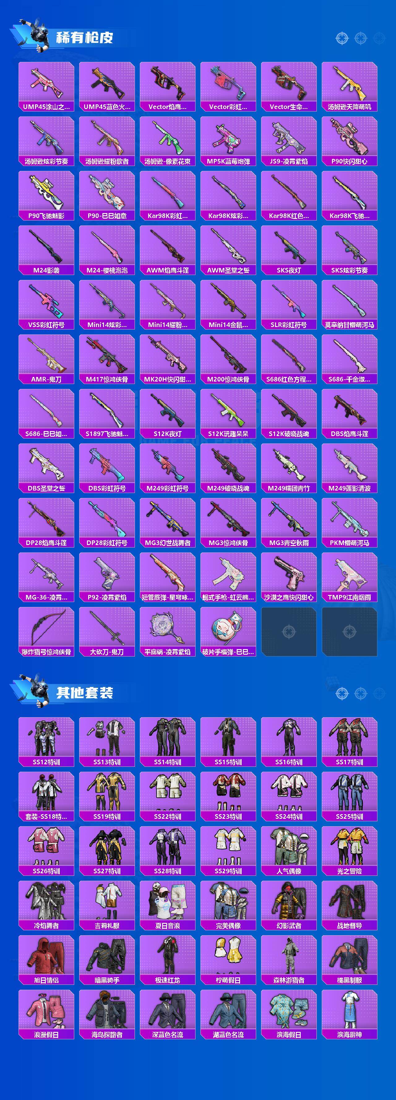 【粉色枪皮等级】:AKM-绿萝繁花(五级),M416-电玩时刻(五级),蜜獾-异瞳寒姬(七级),UMP45-萌骑冒险(四级),Kar98K-巳巳如意(五级),Mk14-福马献瑞(