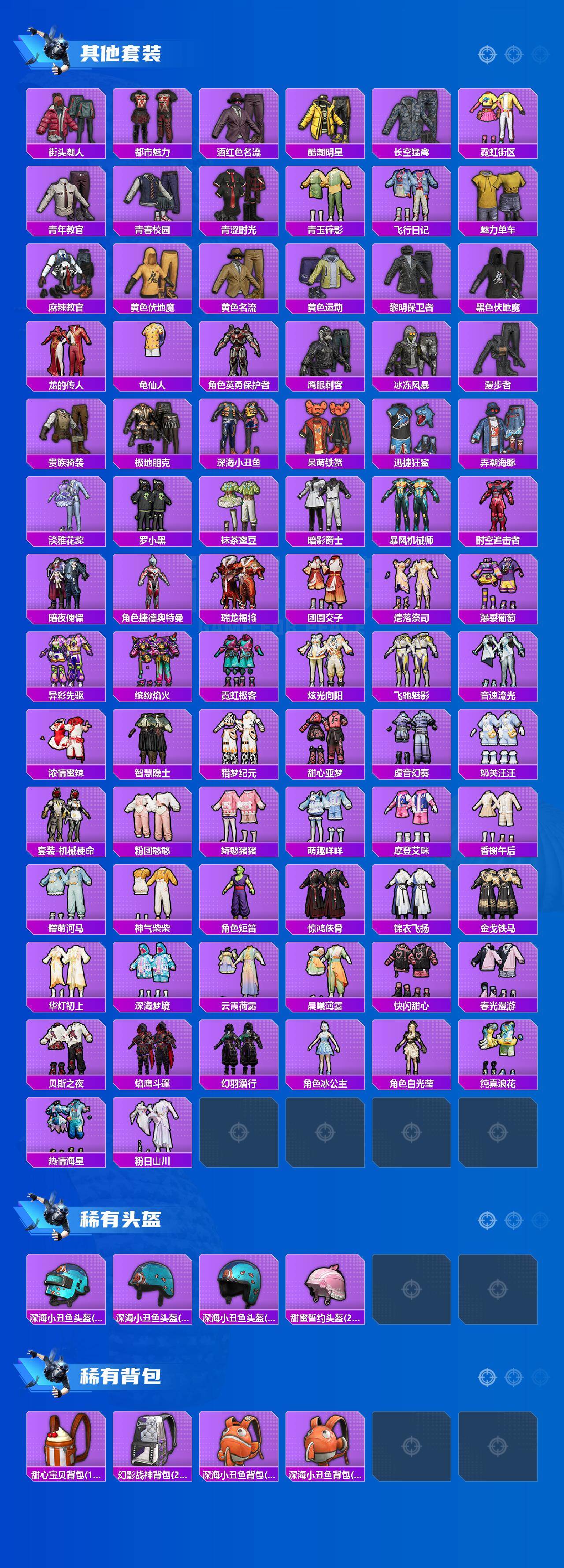 【粉色套装】:粉装-缤纷油彩,粉装-迷蝶贵族,粉装-冰霜白皇,粉装-馨动时刻,粉装-桀骜红莲,粉装-蓝莓炮弹,粉装-暗星紫秘,粉装-冰川幽秘,粉装-第五大道,角色-呆萌星弥,角色-