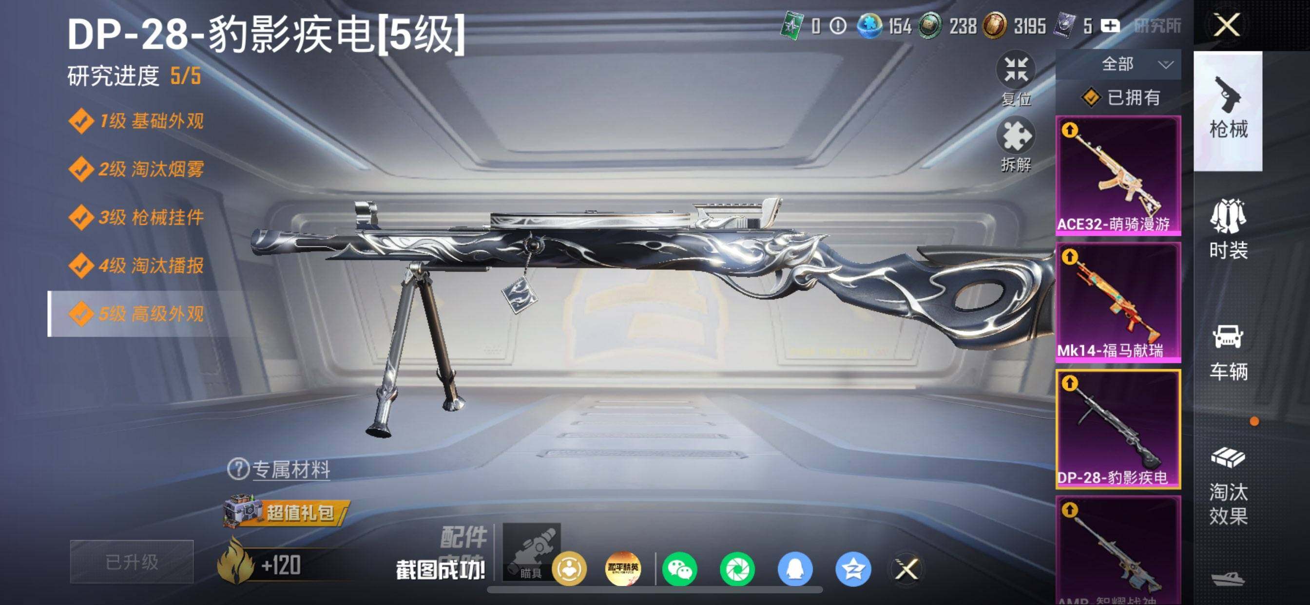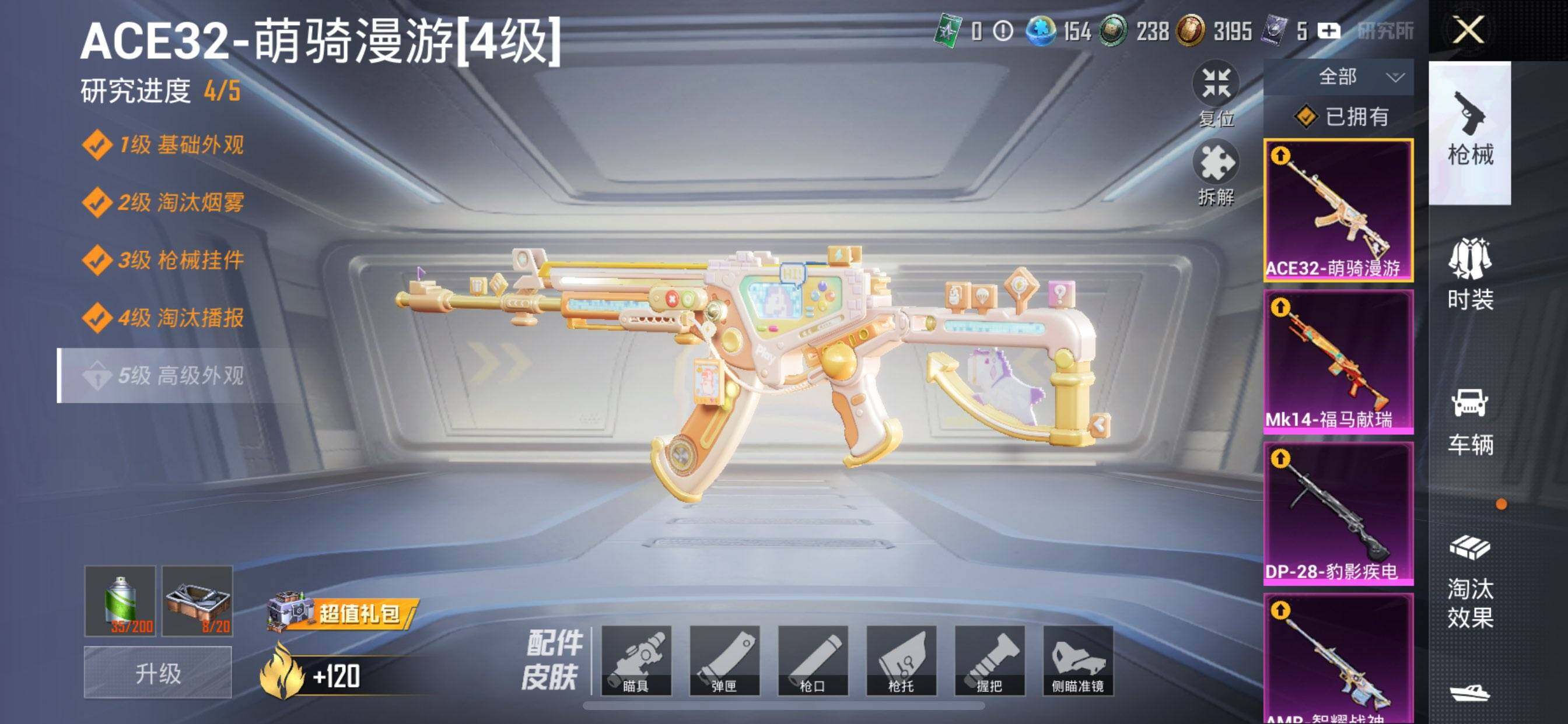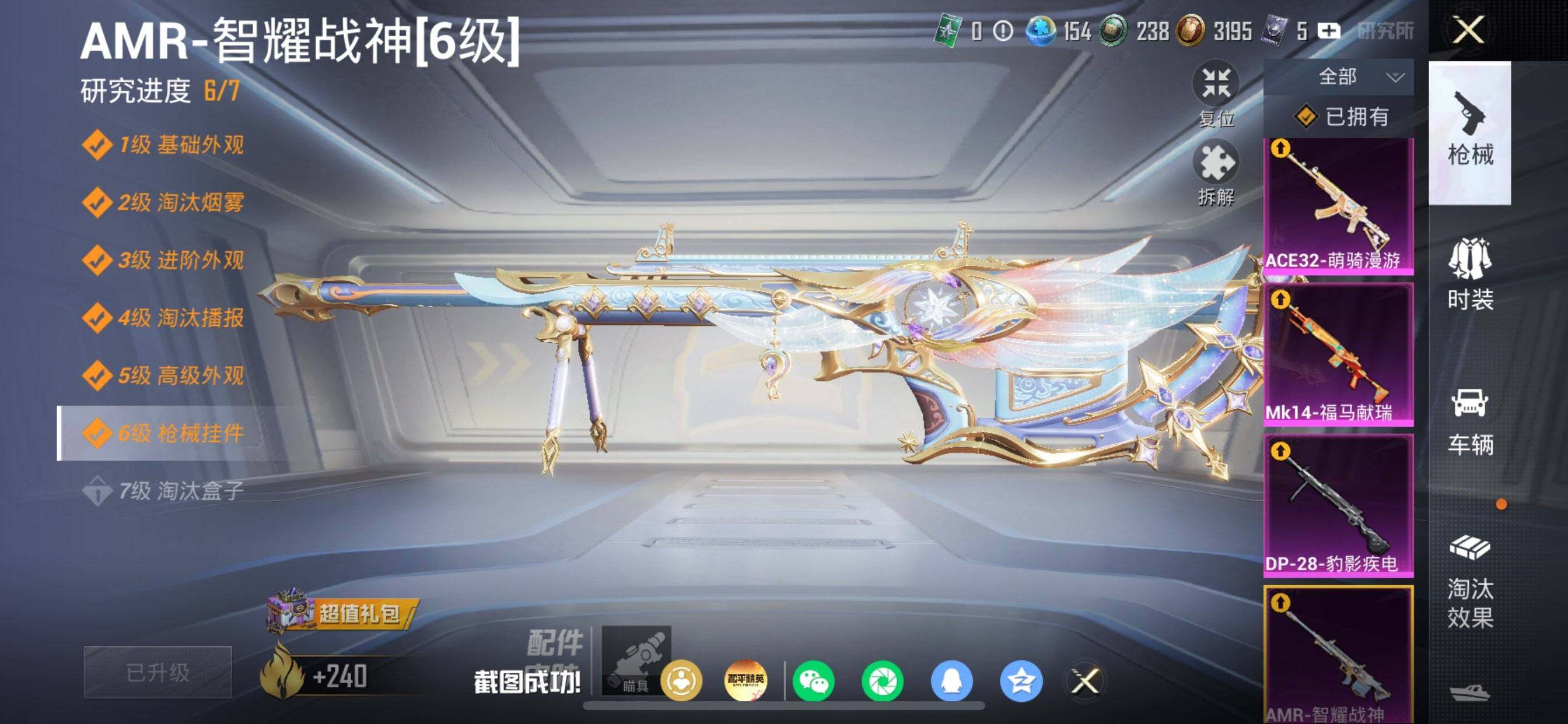 【粉色枪皮等级】:GROZA-镜光银凌(五级),ACE32-萌骑漫游(四级),Kar98K-巳巳如意(五级),Mk14-福马献瑞(五级),AMR-智耀战神(六级),MK12-雪月幻音(四级),DP-28-豹影疾电(