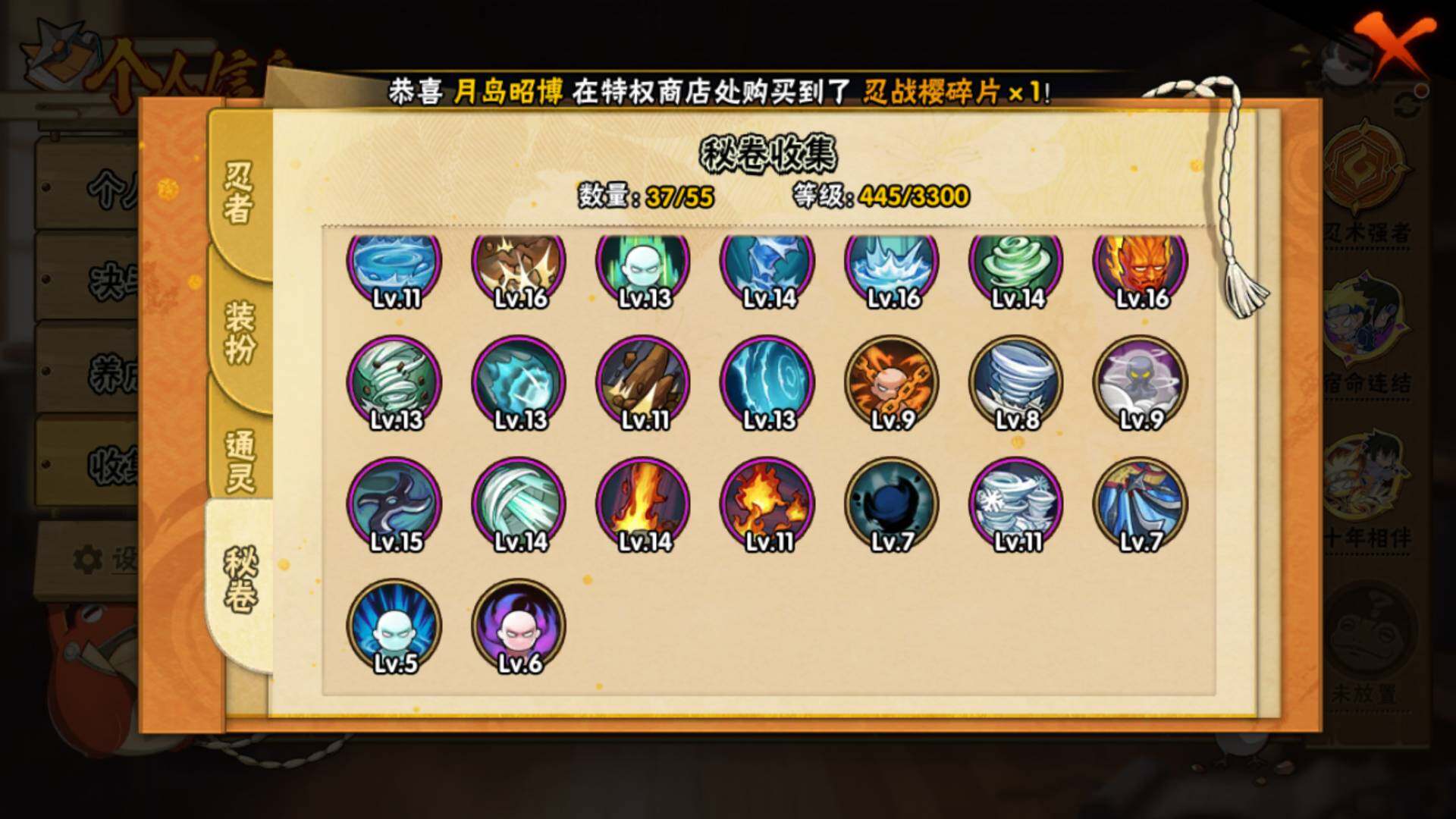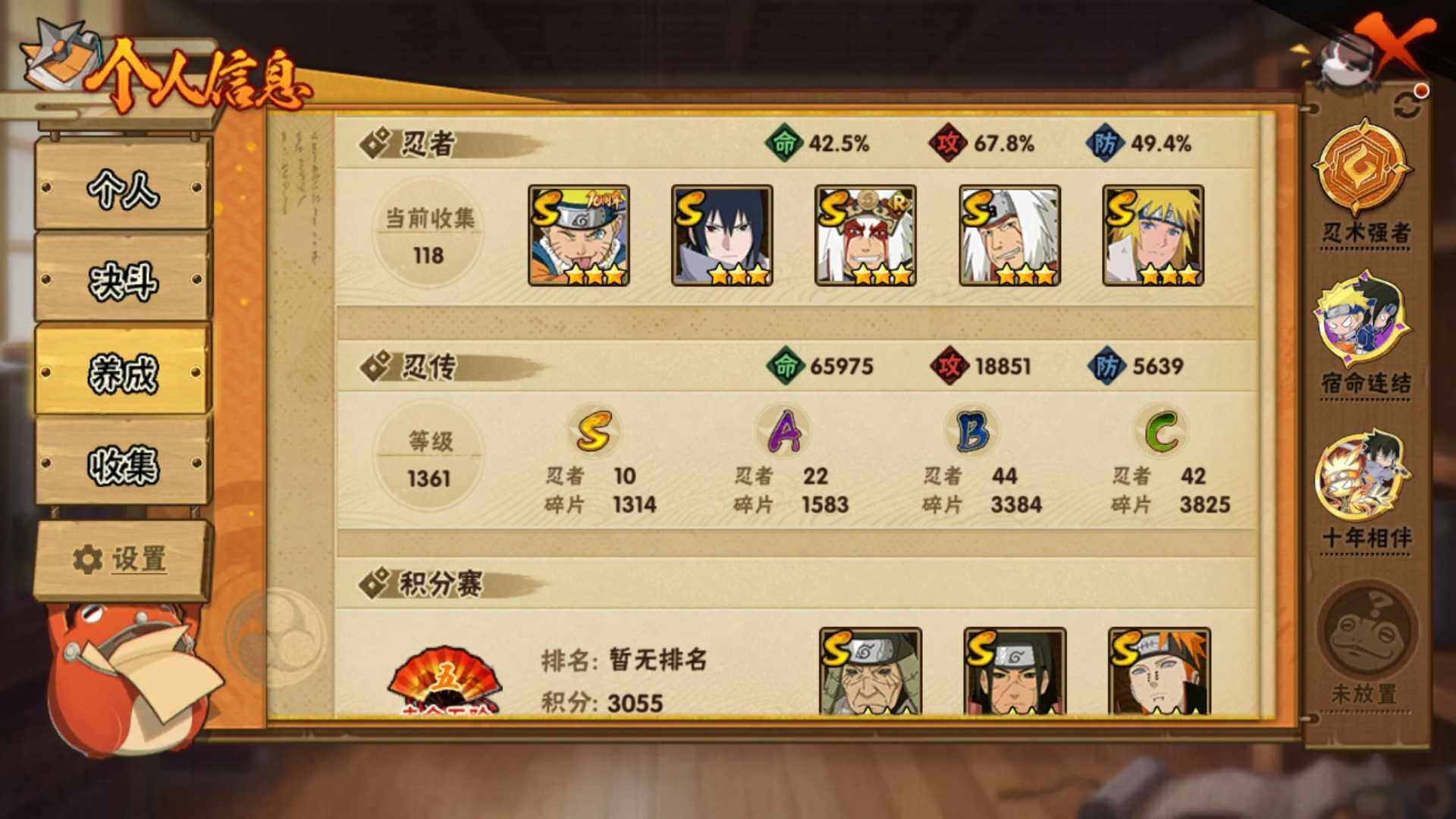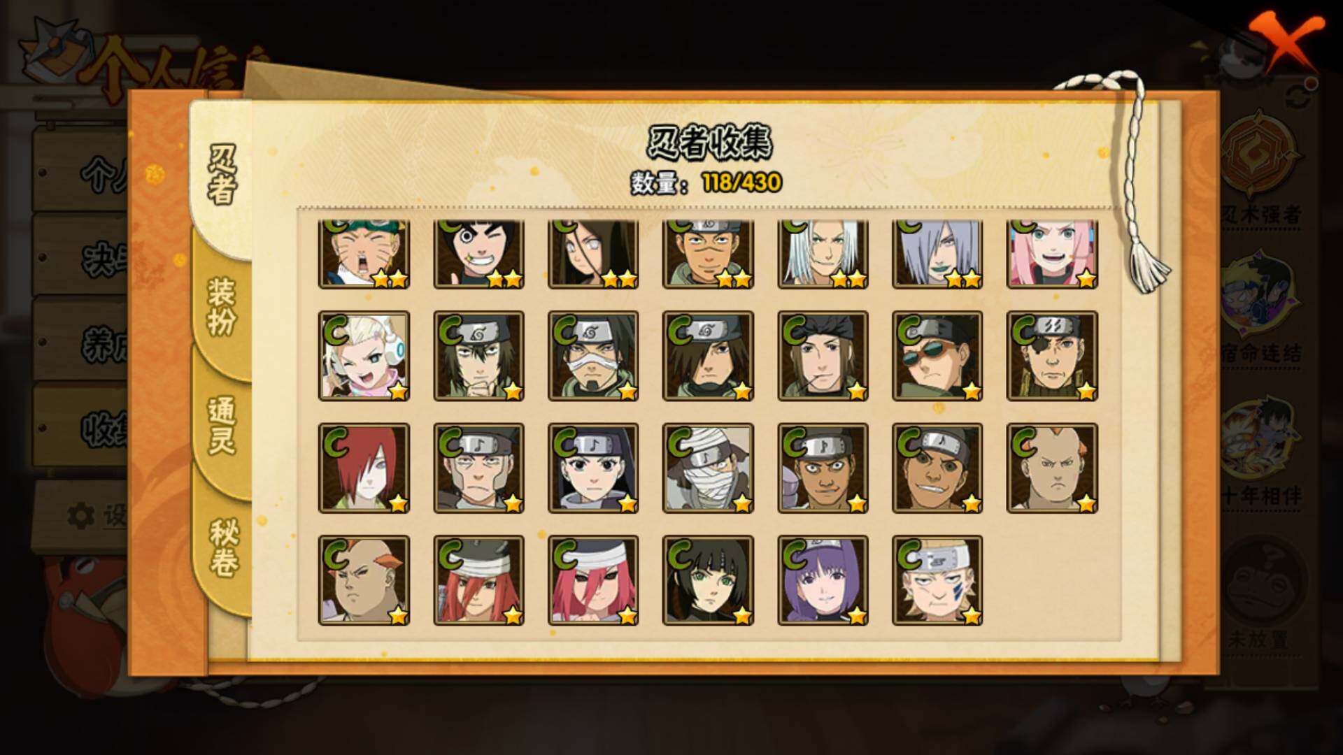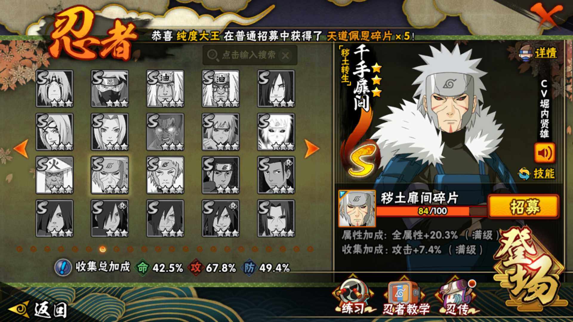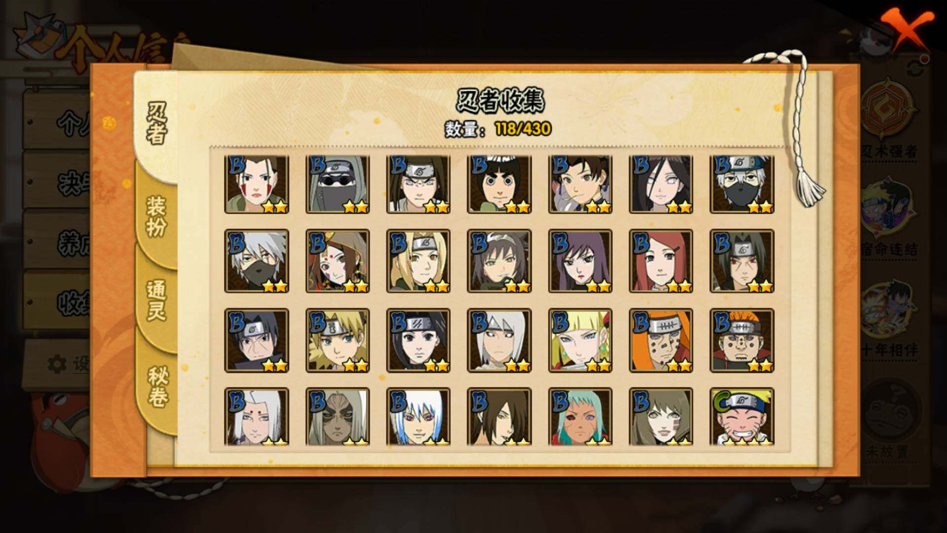【S级忍者】:猿飞日斩「秽土转生」(3星),千手柱间「秽土转生」(3星),宇智波斑「秽土转生」(3星),宇智波鼬「须佐能乎」(3星),自来也「舞之豪杰」(3星),自来也「传说中的三忍」(3星),波风水门(3星),佩恩「天道」(3星),宇智波佐助「永恒万花筒」(3星),漩涡鸣人·宇智波佐