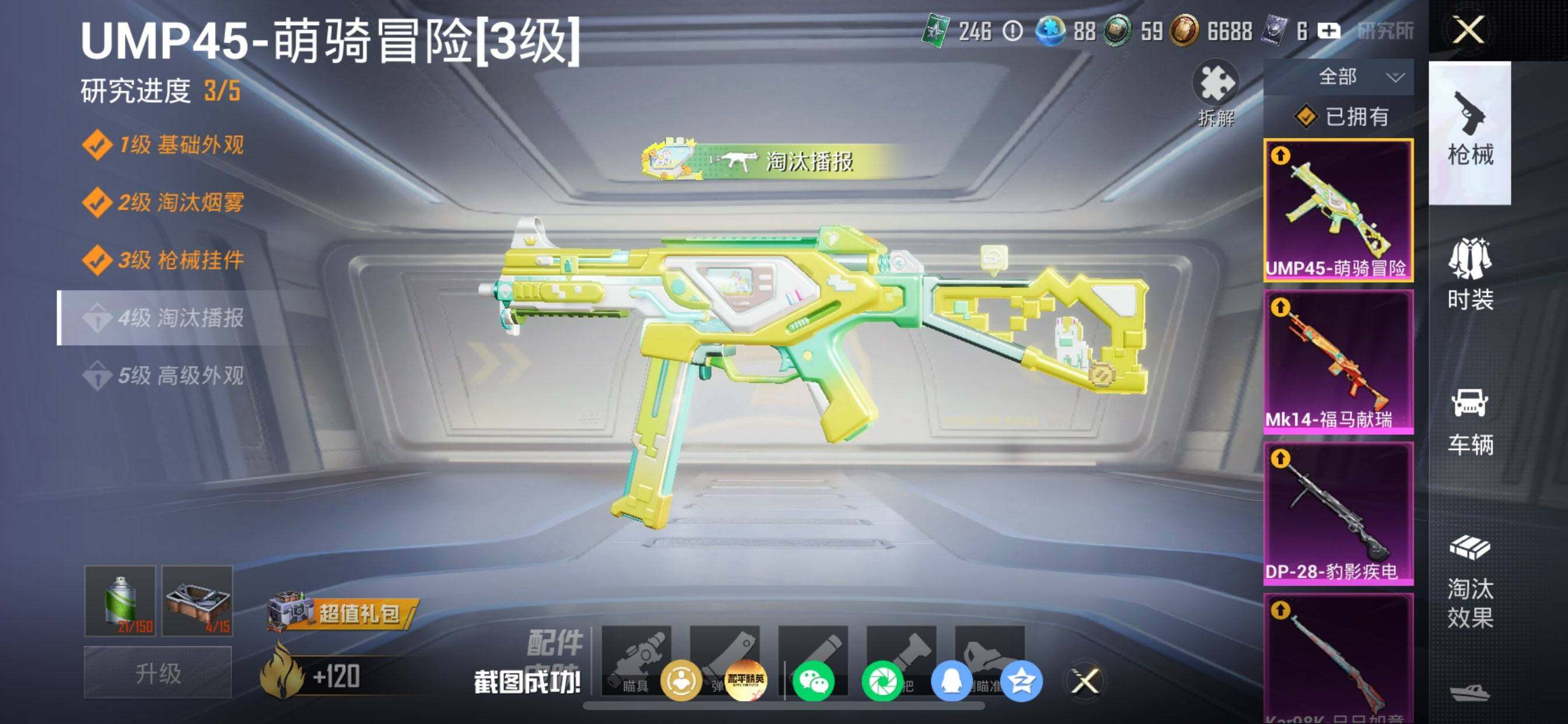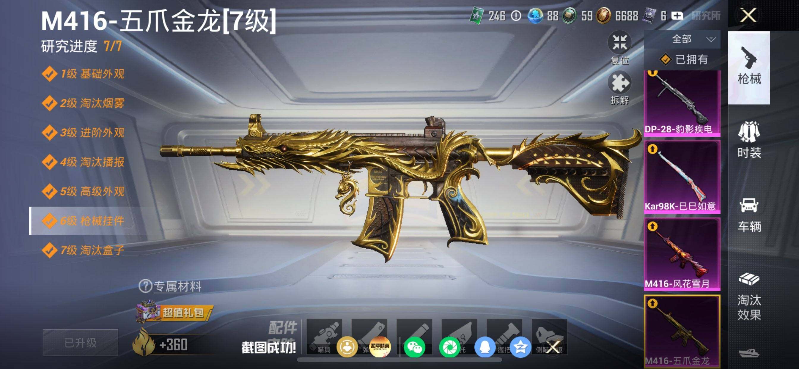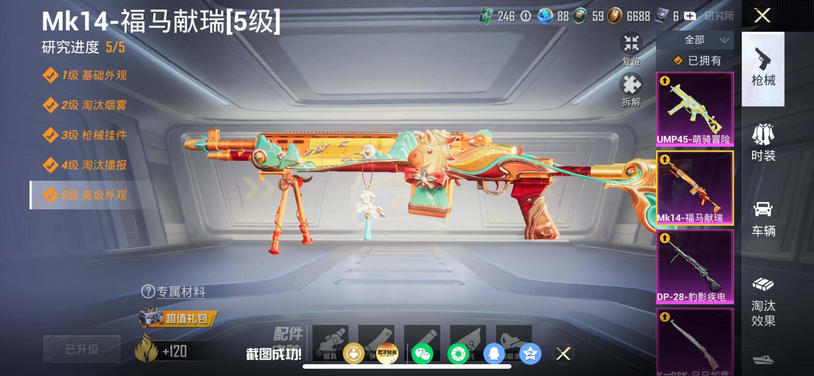 【粉色枪皮等级】:M416-五爪金龙(七级),M416-风花雪月(二级),UMP45-萌骑冒险(三级),Kar98K-巳巳如意(五级),Mk14-福马献瑞(五级),DP-