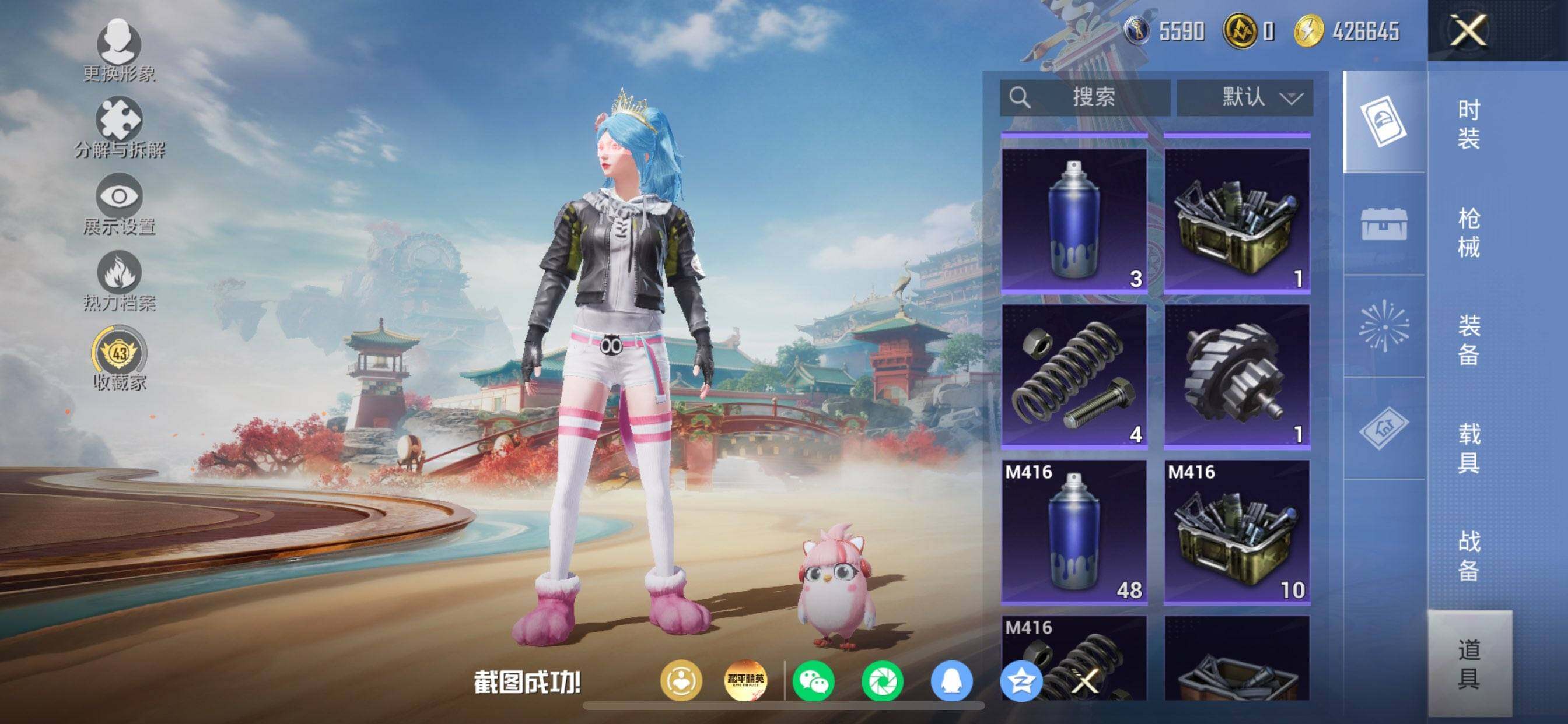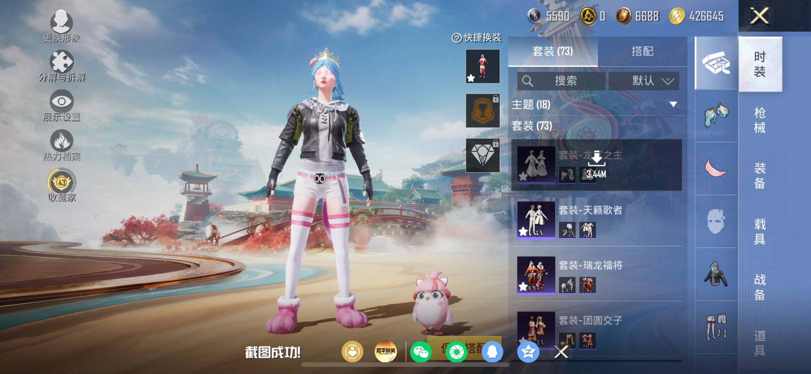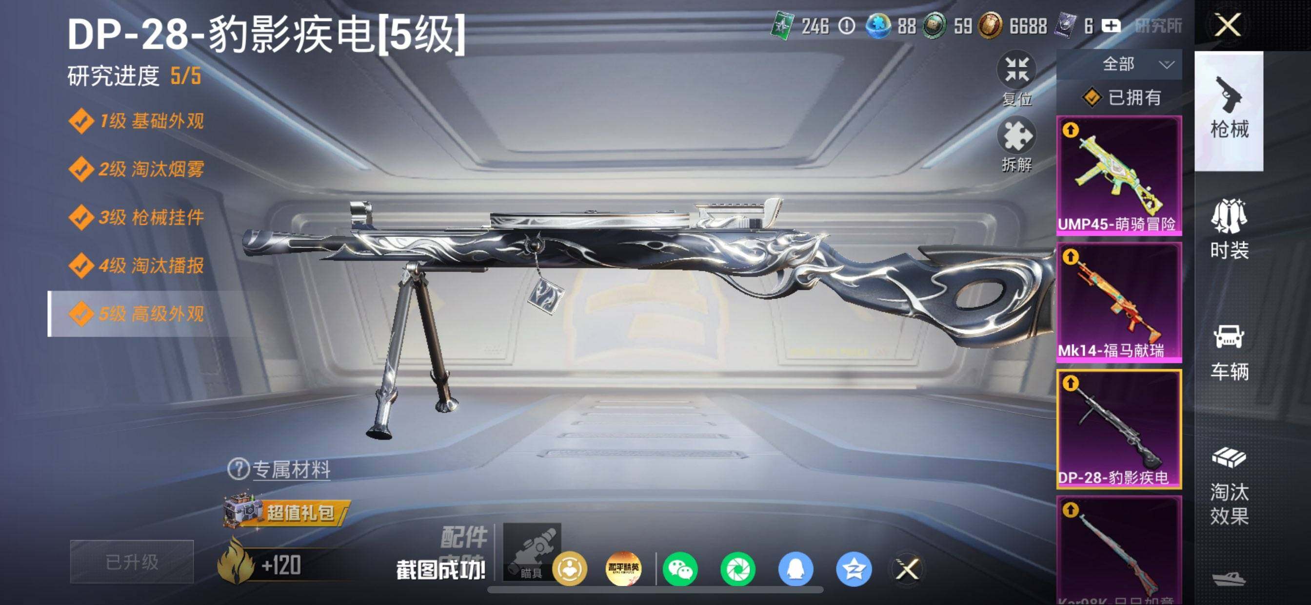 【粉色枪皮等级】:M416-五爪金龙(七级),M416-风花雪月(二级),UMP45-萌骑冒险(三级),Kar98K-巳巳如意(五级),Mk14-福马献瑞(五级),DP-