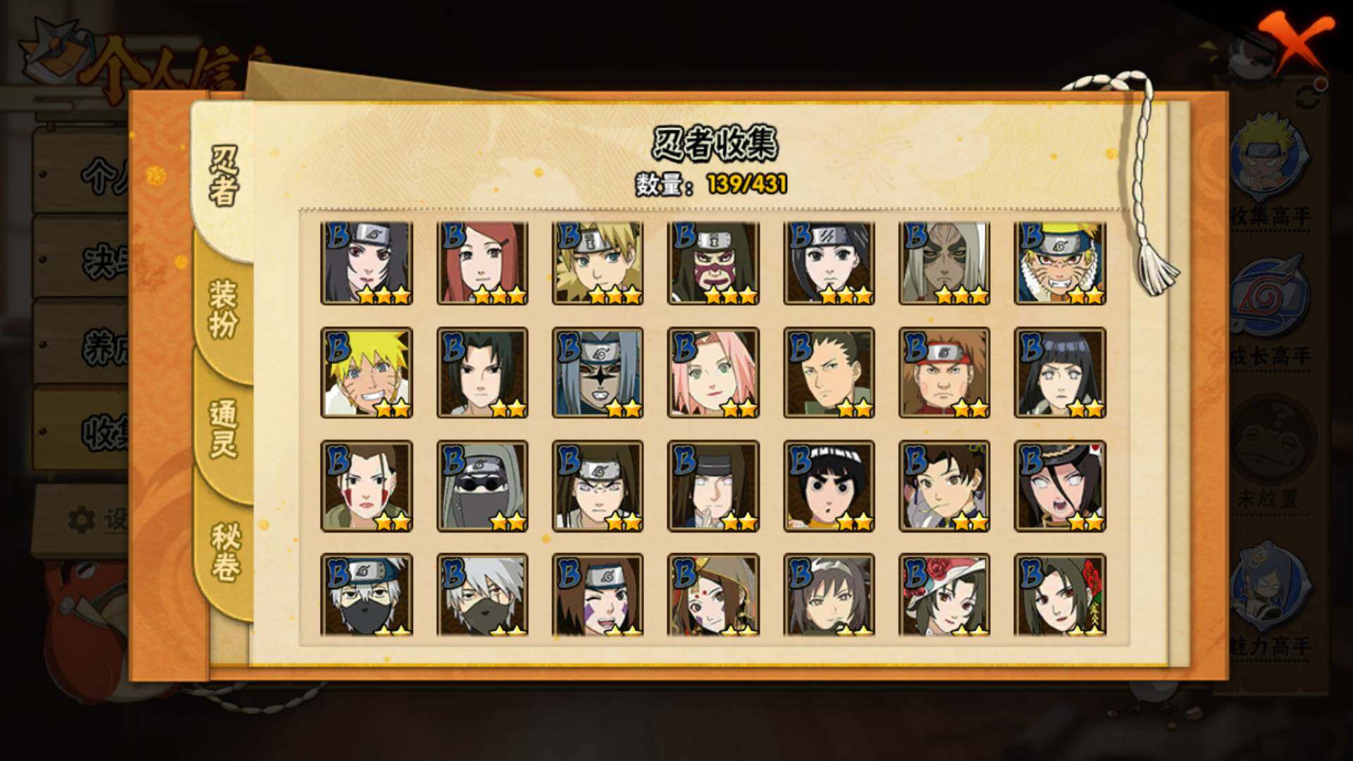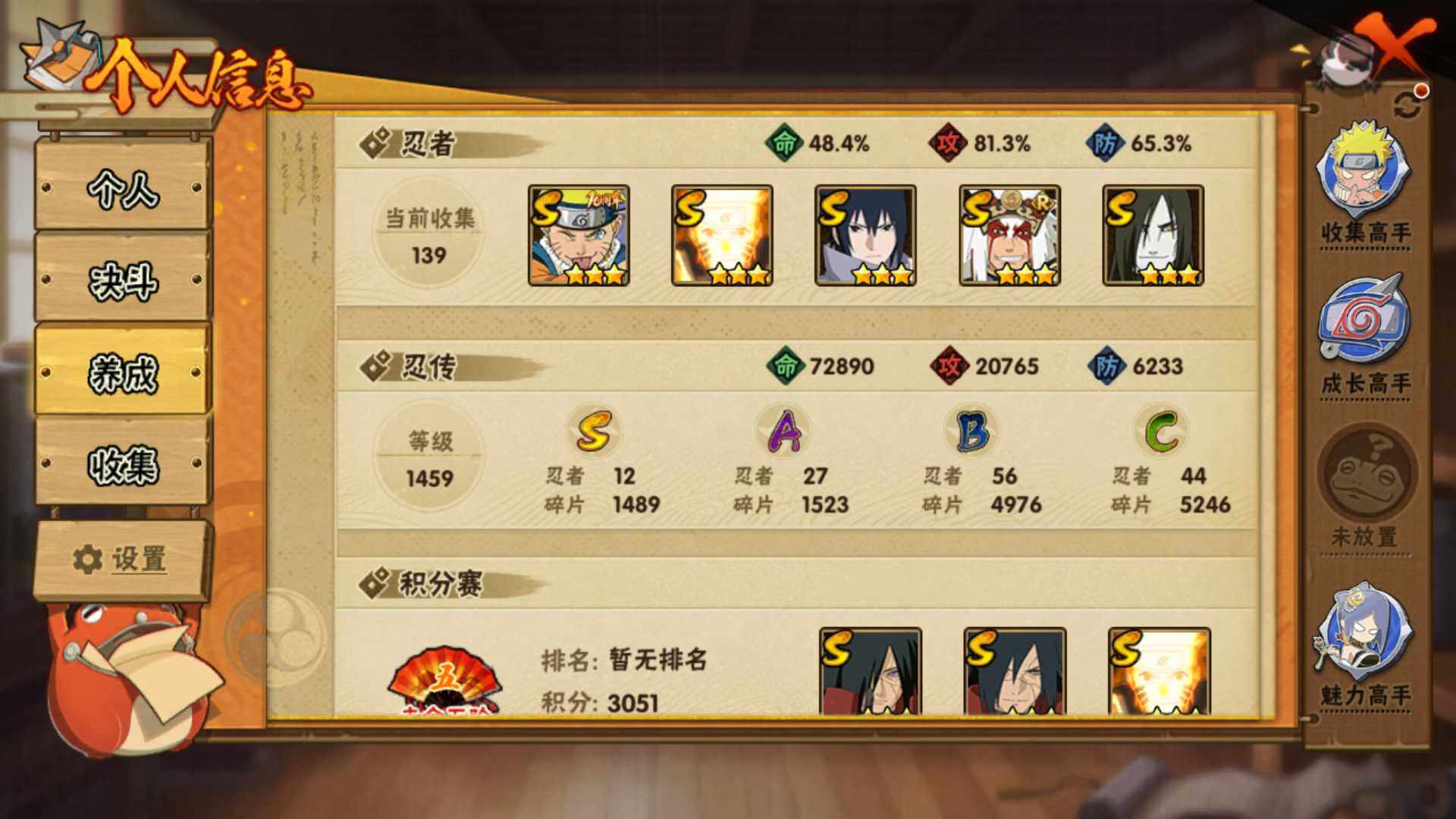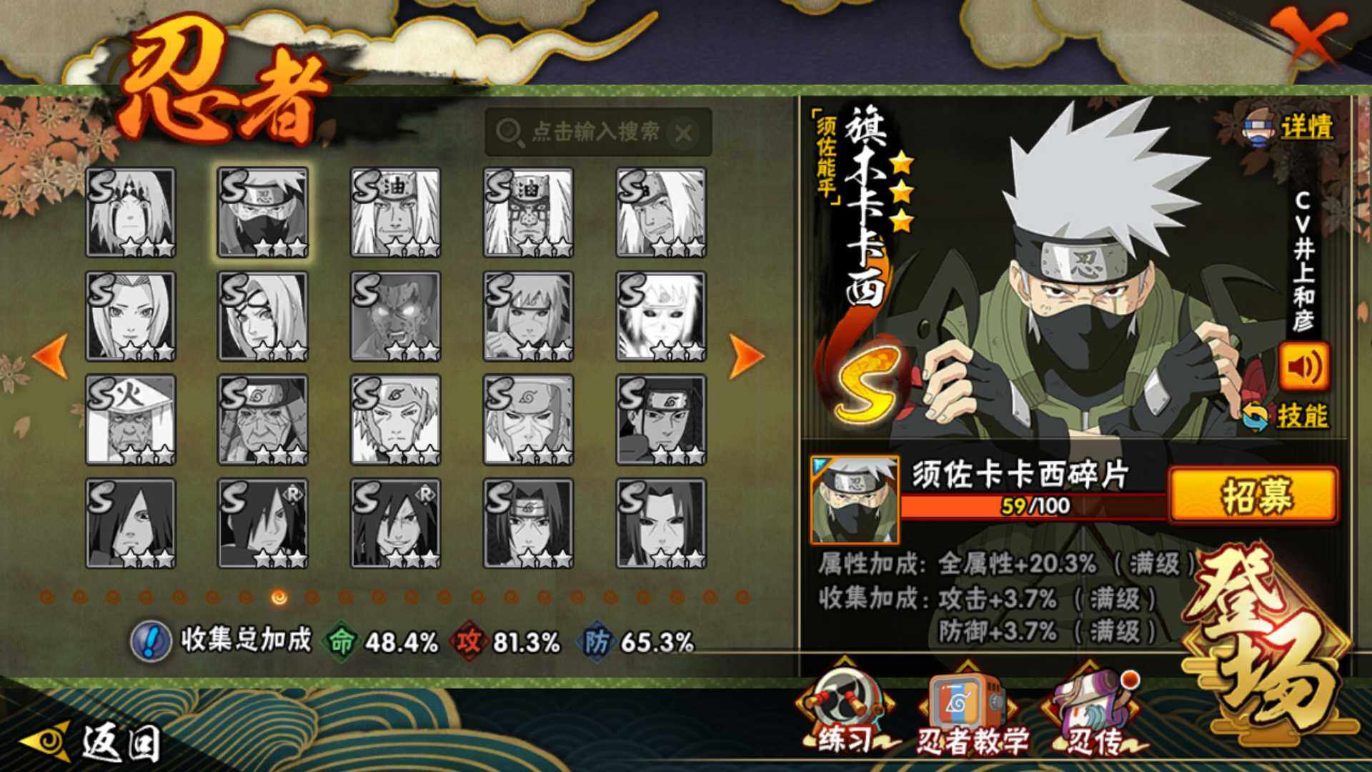 【S级忍者】:千手柱间「秽土转生」(3星),宇智波斑「秽土转生」(3星),宇智波斑「秽土转生·解」(3星),千手柱间「木叶创立」(3星),自来也「舞之豪杰」(3星),大蛇丸(3星),波风水门(3星),漩涡鸣人「九喇嘛连结」(3星),佩恩「天道」(3星),宇智波佐助「永恒万花筒」(3星),漩涡鸣
