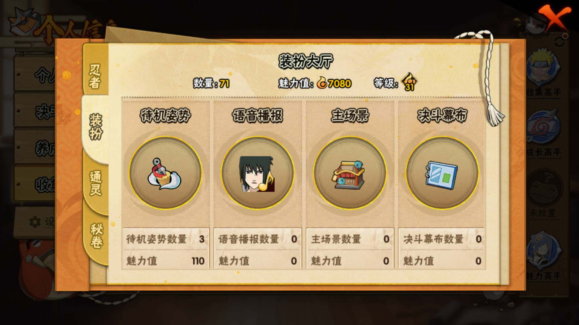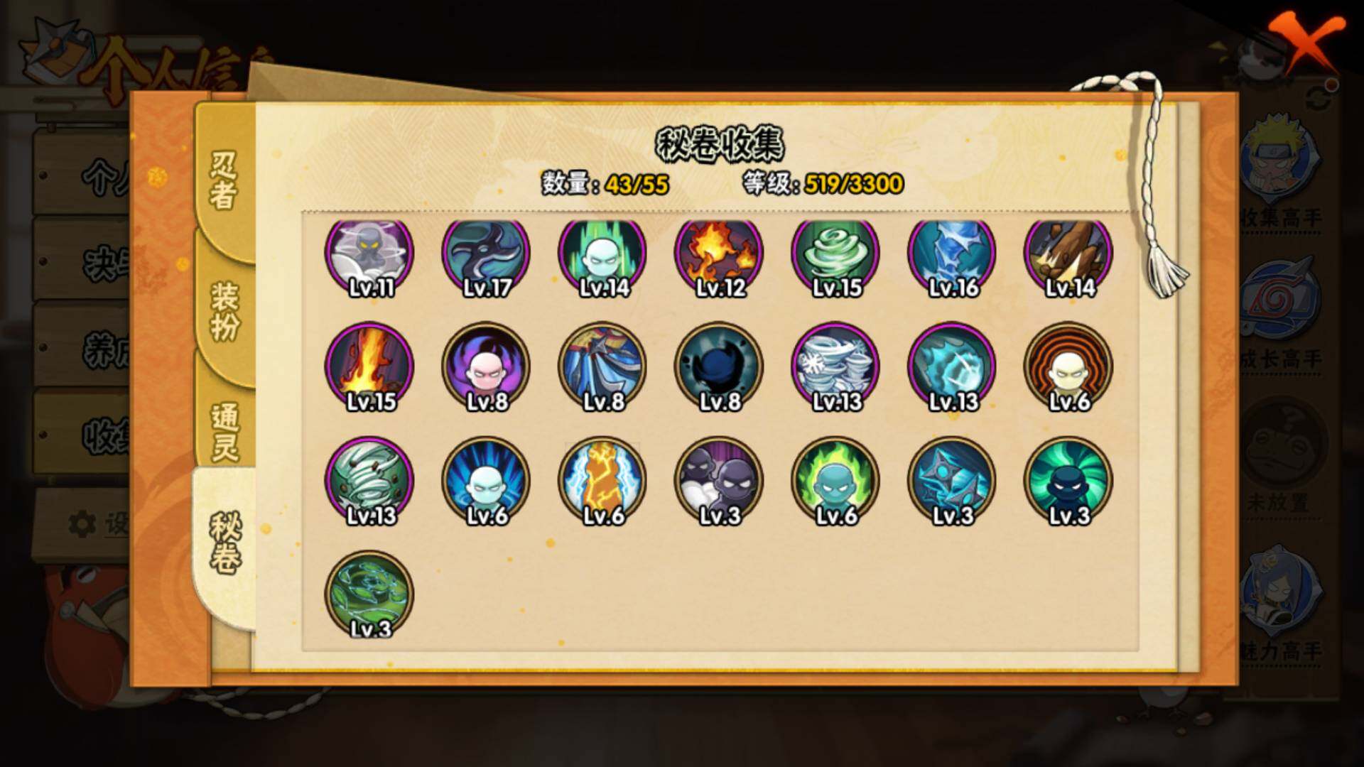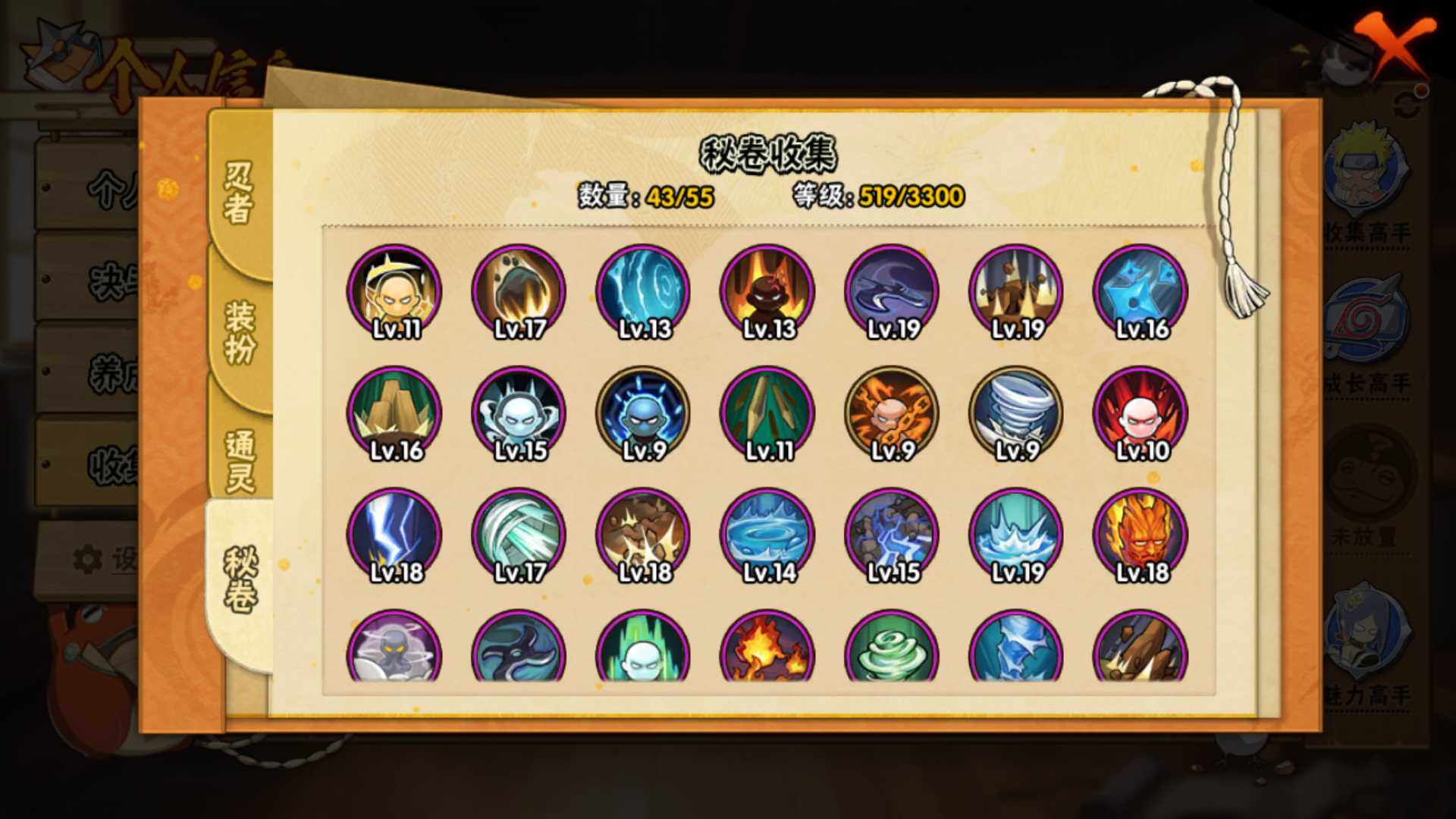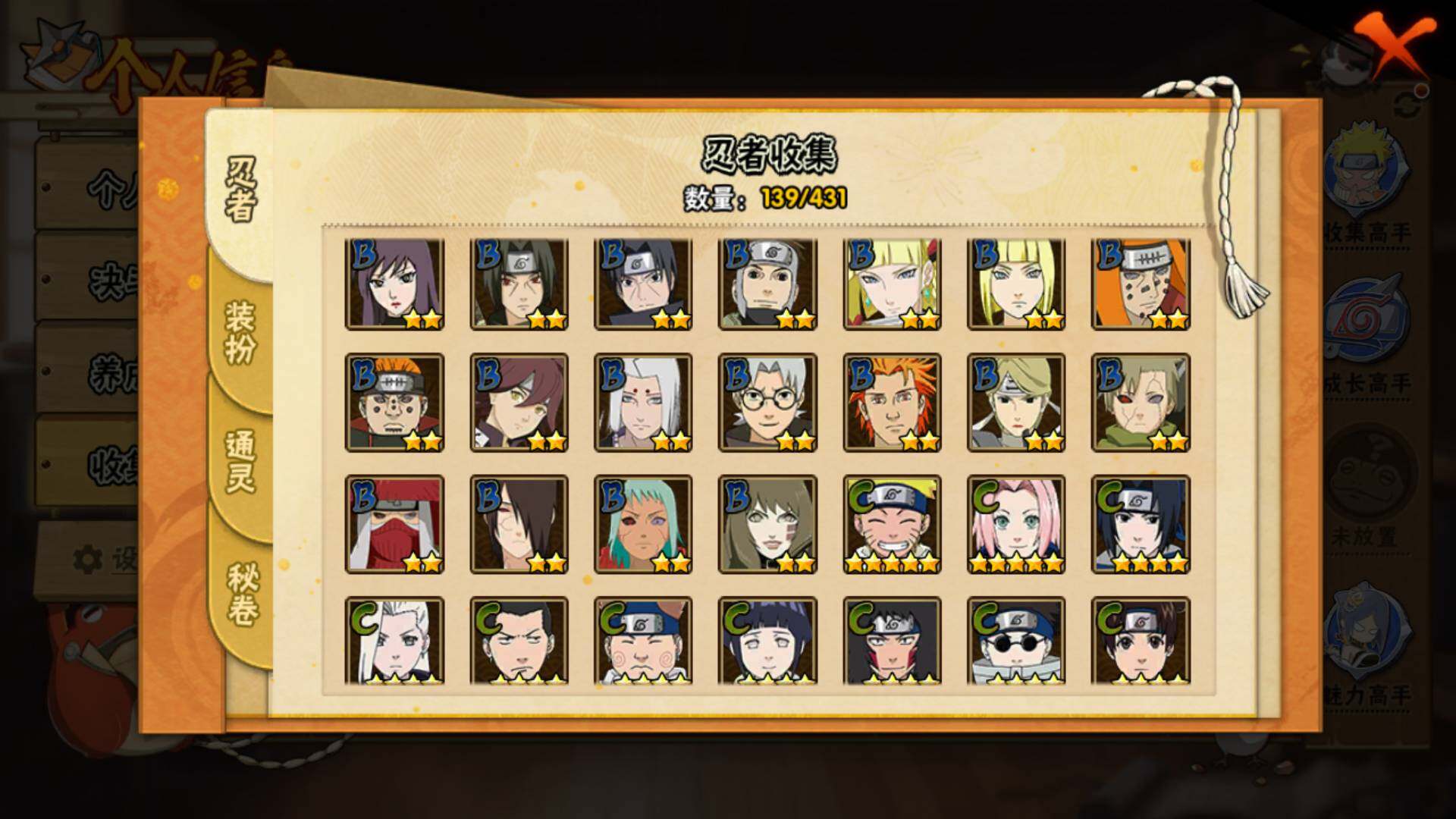 【S级忍者】:千手柱间「秽土转生」(3星),宇智波斑「秽土转生」(3星),宇智波斑「秽土转生·解」(3星),千手柱间「木叶创立」(3星),自来也「舞之豪杰」(3星),大蛇丸(3星),波风水门(3星),漩涡鸣人「九喇嘛连结」(3星),佩恩「天道」(3星),宇智波佐助「永恒万花筒」(3星),漩涡鸣