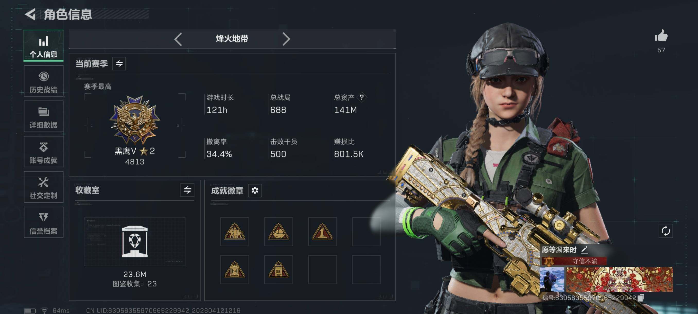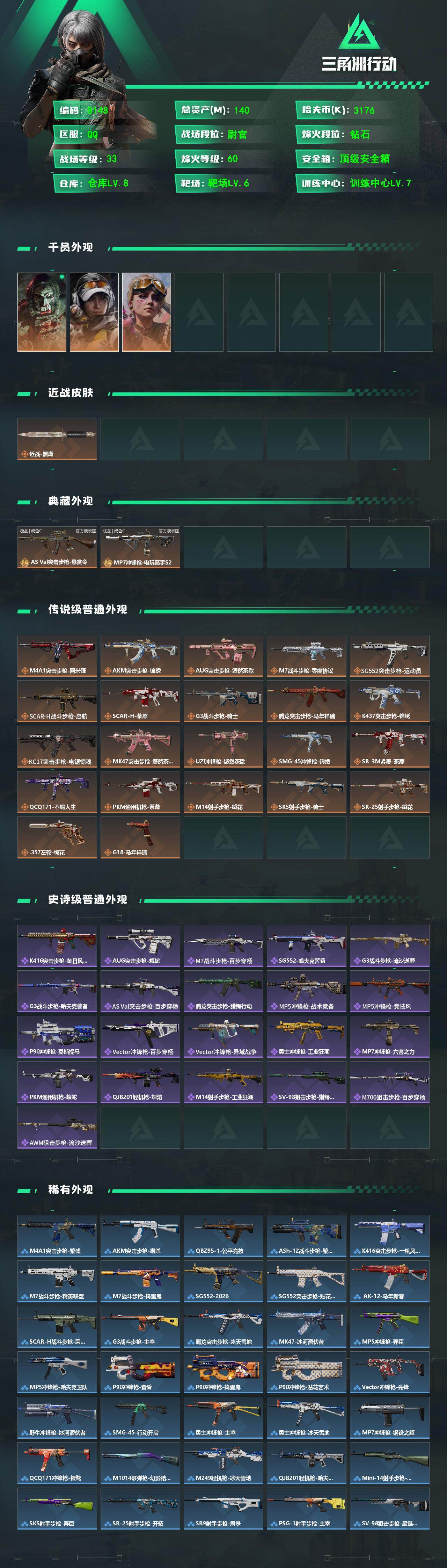 {特价出售}等级: 60 总资产:141M 流动资产:106.2 M 纯币:3176k 隐藏挂饰:财神到 战令皮肤:蛊-不羁人生/露娜-金牌射手/红狼-电锯惊魂 刀皮: 砖皮:AS Val突击步枪-悬赏令(极品C)/MP7冲锋枪-电玩高手S2(优品C) 特勤处:仓库8,训练7,靶场6