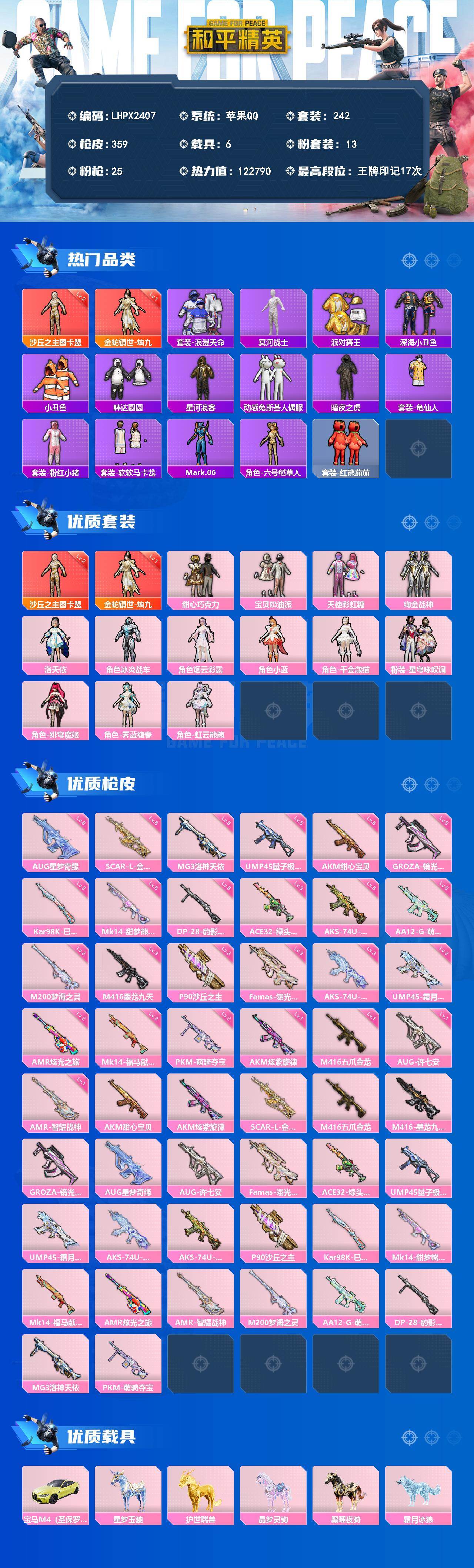 AUG-星梦奇缘(六级)/沙丘之主-图卡盟(二级)【特价出售/店主推荐--老木乃伊/浪漫天命/金鞋/小丑鱼/小螳螂/暗夜之虎/洛天依】 苹果 手Q-2神装-13粉装-25特效枪-6载具-15粉色飞行器-122790热力值-17王牌印记-242套装-359枪皮【红色神装等级】:金蛇镇世-烛九(一级),沙丘之主-图卡盟(二级)【热门品类】:套装-浪漫天命,套装-冥河战士,套装-派对舞王,套装-深海小