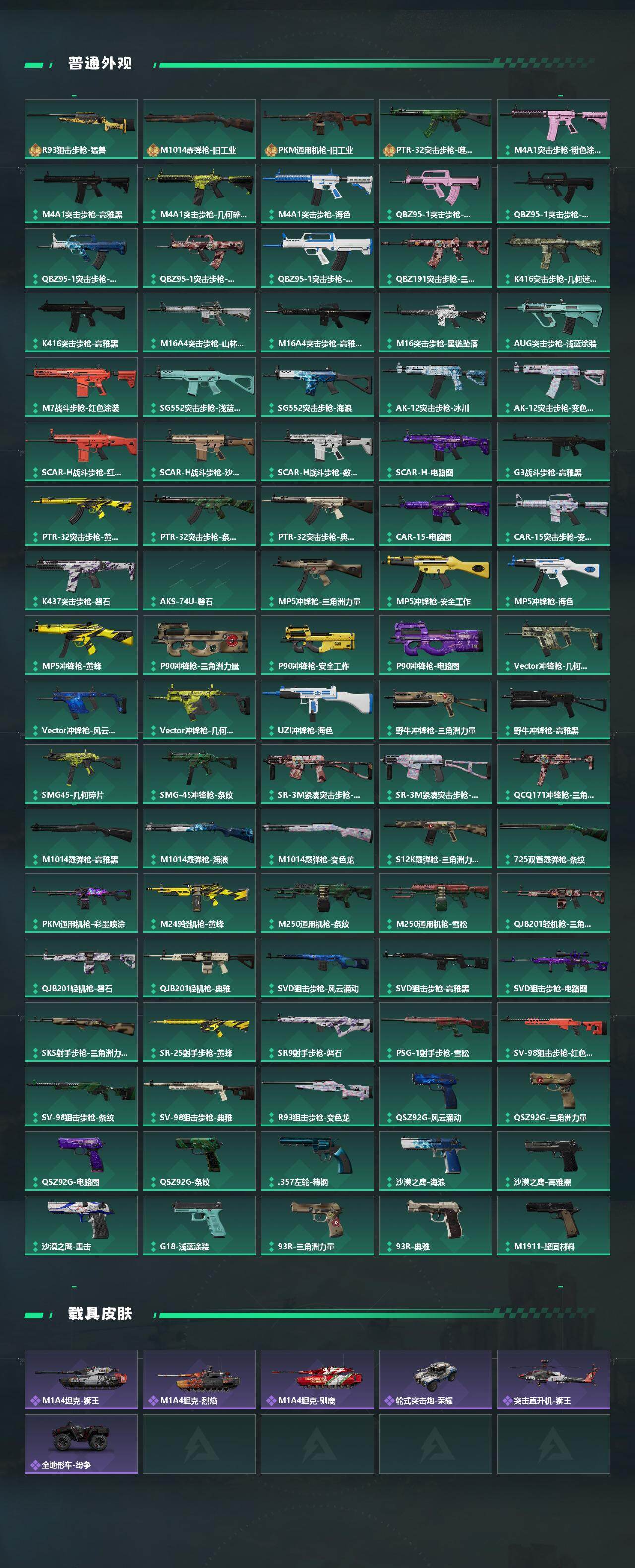 【传说外观】:M4A1突击步枪-蚀金玫瑰,M4A1突击步枪-阿米娅,ASh-12战斗步枪-鹅鸭杀,M16A4突击步枪-狩猎时刻,M7战斗步枪-神秘艺术,SG552突击步枪