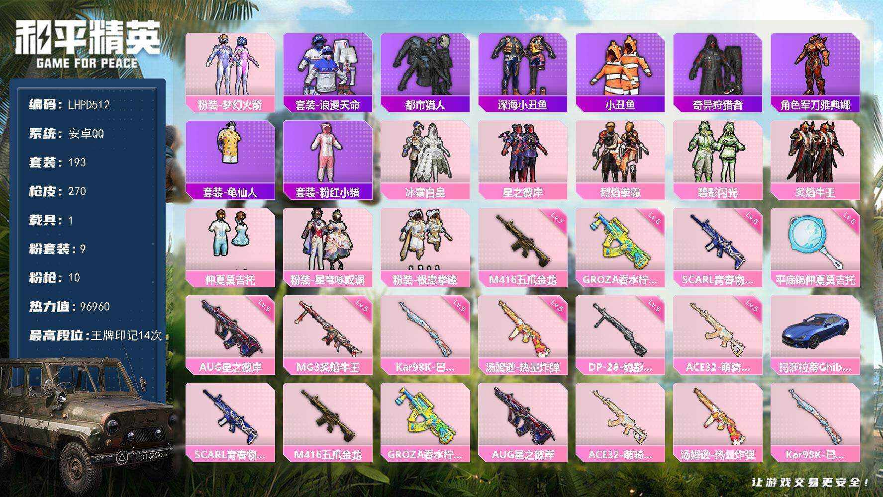 【店主推荐捡漏号!可直接换绑】安卓 手Q-9粉装-10特效枪-1载具-1粉色飞行器-96960热力值-14王牌印记-193套装-270枪皮【热门品类】:粉装-梦幻火箭,套装-浪漫天命,套装-都市猎人,套装-深海小丑鱼,套装-小丑鱼,套装-奇异狩猎者,角色-军刀雅典娜,套装-龟仙人,套装-粉红小猪【粉色套装】:粉装-梦幻火箭,粉装-冰霜白皇,粉装-星之彼岸,粉装-烈焰拳霸,粉装-碧影闪光,粉装-炙