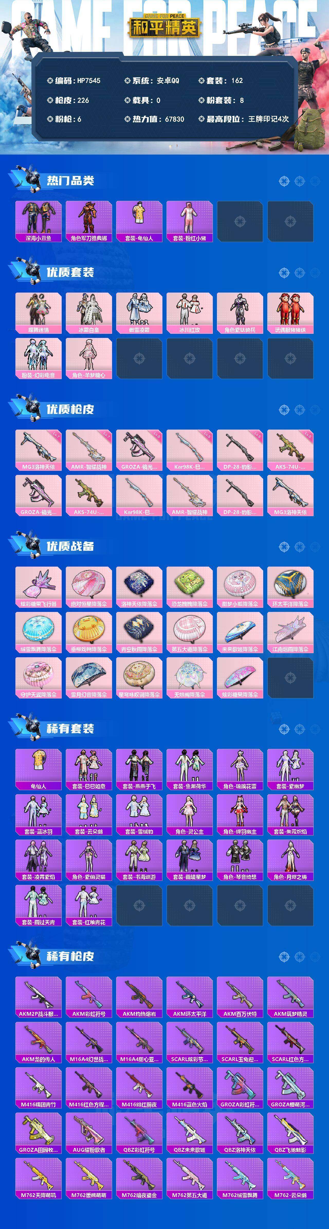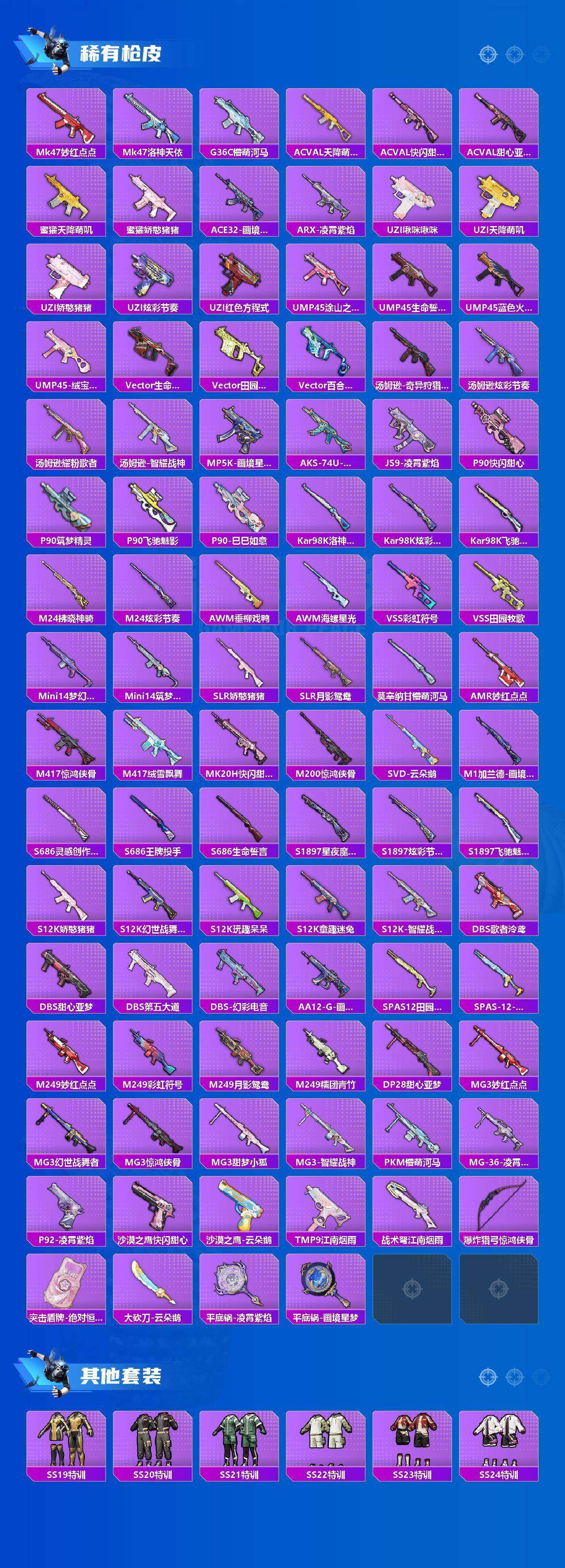 ( 8粉套6粉枪)地铁满天赋/粉红小猪/蝶舞迷情/冰霜白皇/傲雪凌霜/冰川红玫/紫钛骑兵/猪猪侠/幻彩电音/羊梦糖心/GROZA镜光银凌五级/AKS74U森灵之息五级/Kar98K巳巳如意五级/AMR智耀战神七级/DP28豹影疾电五级/MG3洛神天依七级/没战神框/HP7545-1粉色飞行器-67830热力值-4王牌印记-162套装-226枪皮