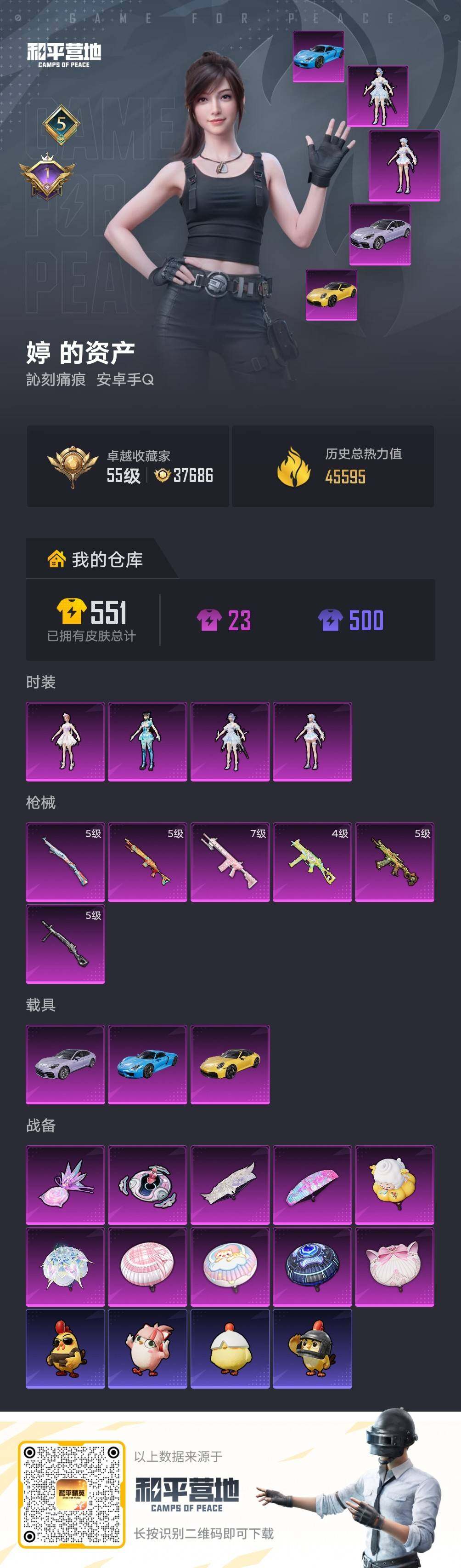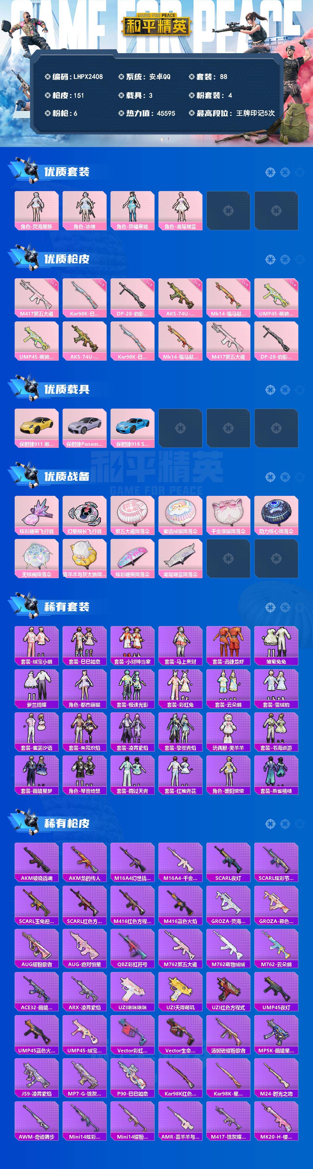 【特价出售/店主推荐】安卓 手Q-4粉装-6特效枪-3载具-2粉色飞行器-45595热力值-5王牌印记-88套装-151枪皮【粉色套装】:角色-荧海星豚,角色-冰魄,角色-异瞳寒姬,角色-鸢尾珑雾【粉色枪皮等级】:UMP45-萌骑冒险(四级),AKS-74U-森灵之息(五级),Kar98K-巳巳如意(五级),Mk14-福马献瑞(五级),M417-第五大道(七级),DP-28-豹影疾电(五级)【粉