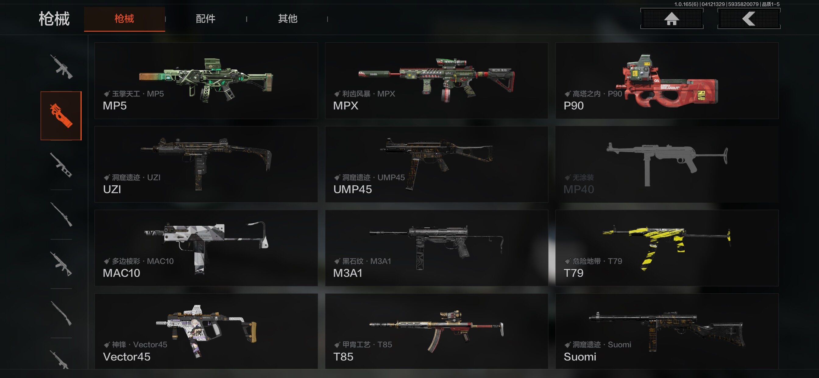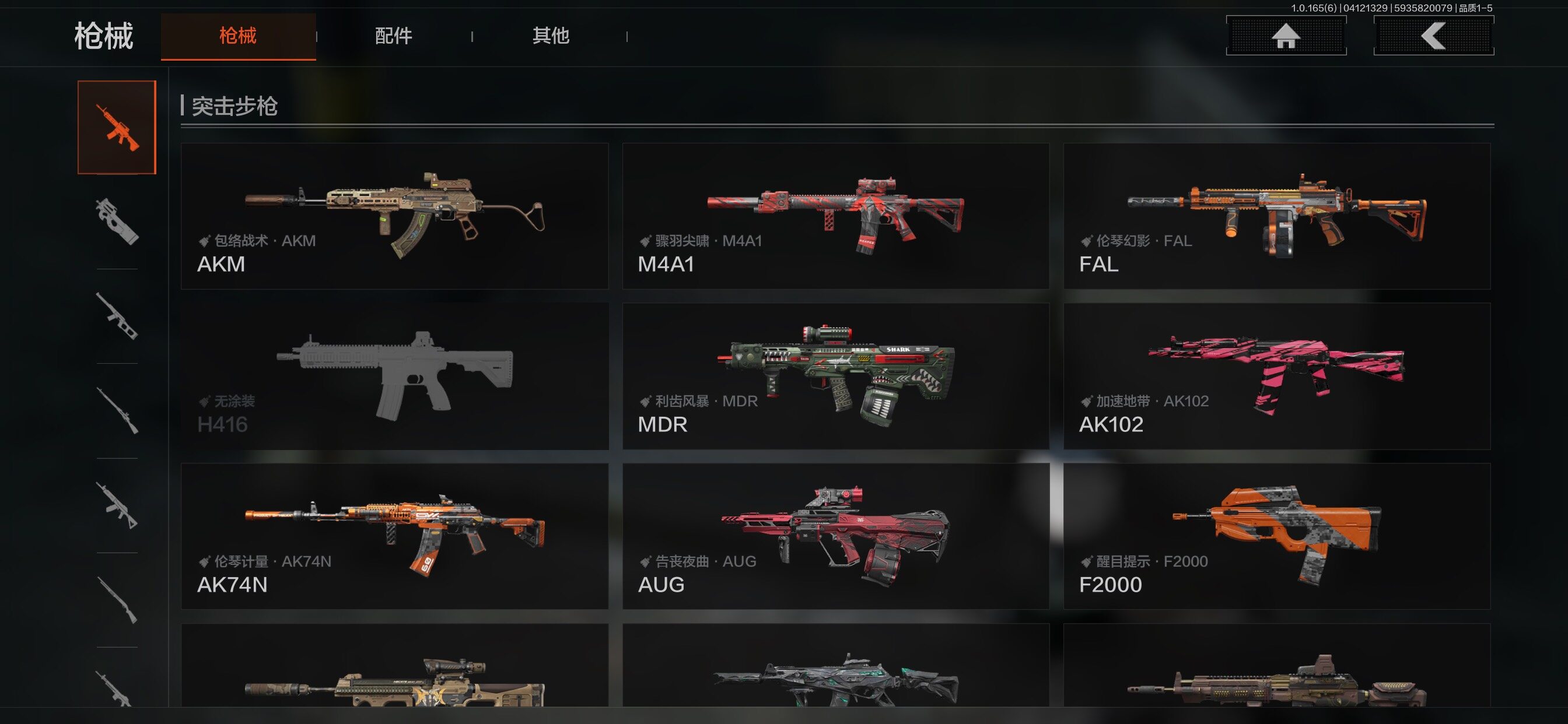 【金色枪皮】:包络战术AKM,伦琴幻影FAL,告丧夜曲AUG,地脉深处ACE31,百锻铁骑AEK,旧王圣谕QBZ191,玉擎天工MP5,利齿风暴MPX,旧王圣谕VSS