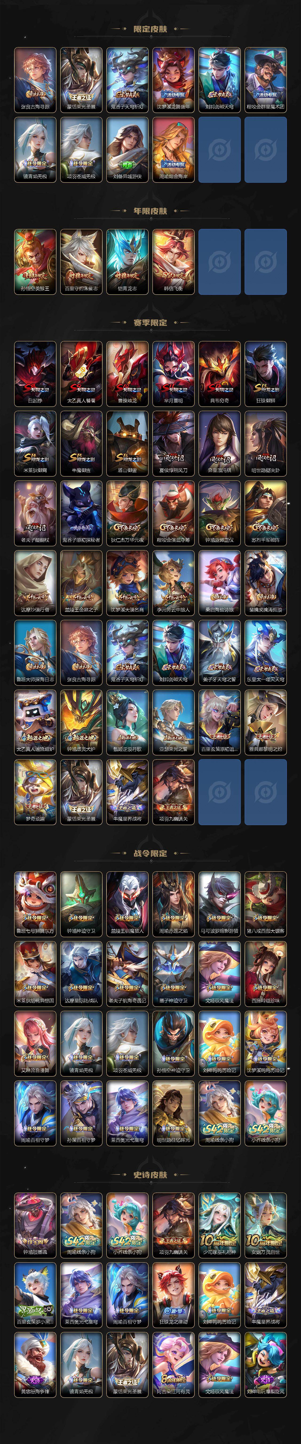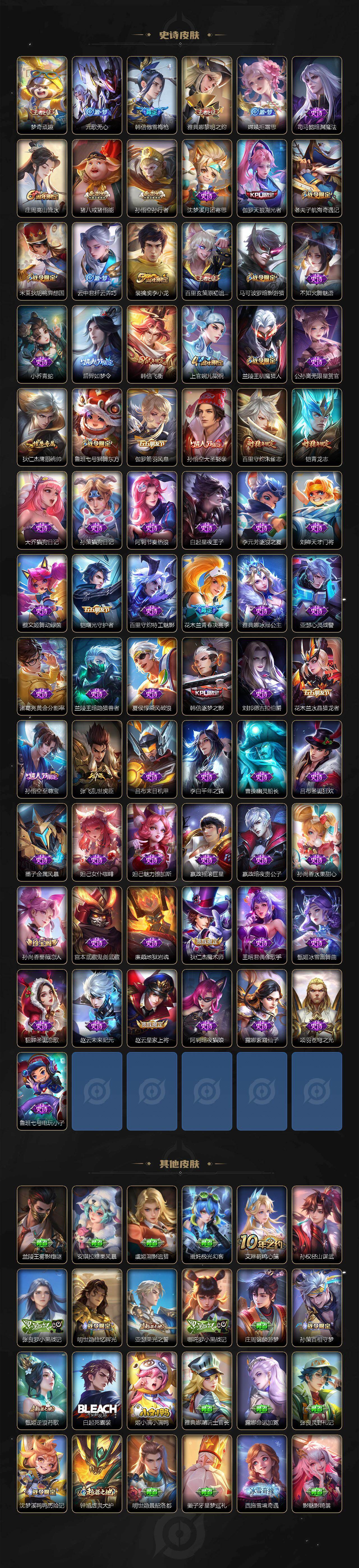 【传说皮肤】:杨戬纵目迁山,云缨幻光神枪,桑启鸣野蒿,典韦战鼓燎原,澜逐花归海,孙悟空齐天大圣,百里守约碎云,虞姬启明星使,孙悟空零号赤焰,干将莫邪久胜战神,后羿黄金射手座,孙尚香末