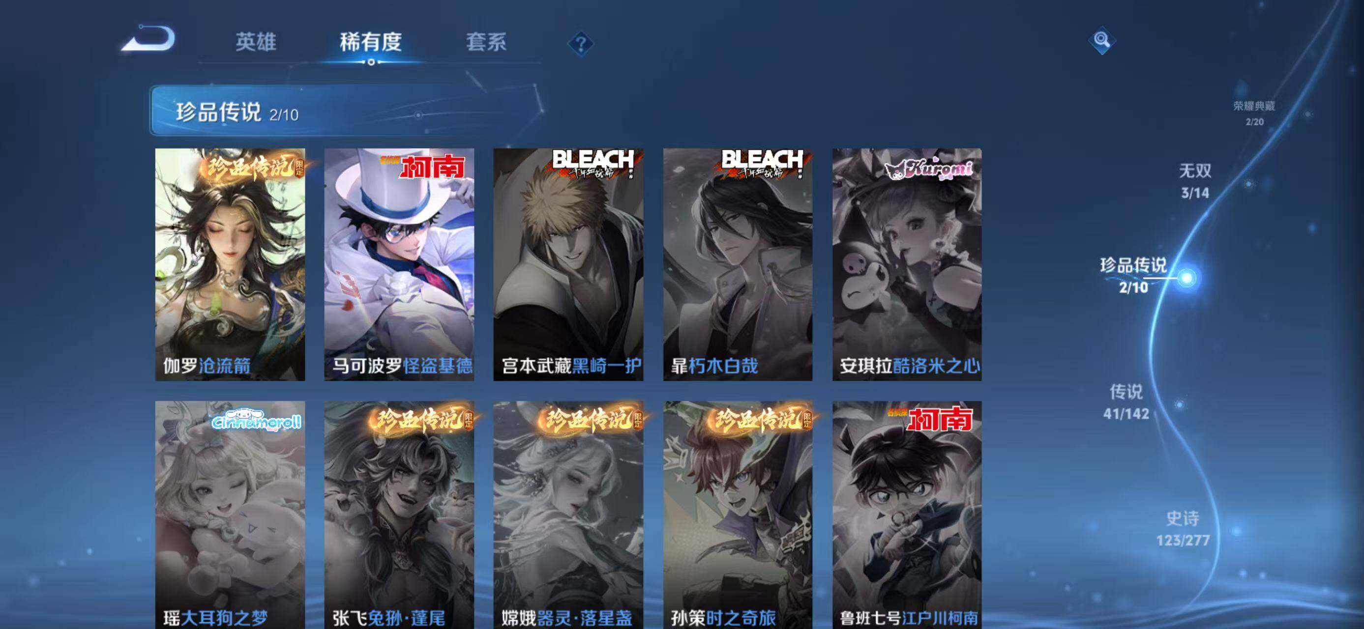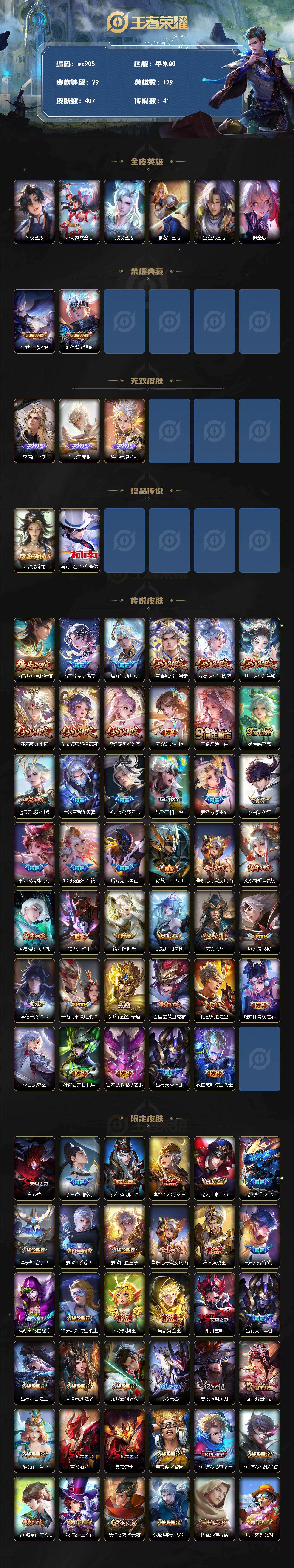 苹果Q-V9-尊贵铂金II段位-129英雄-407皮肤-2典藏皮肤-3无双-2珍品传说-41传说-121史诗