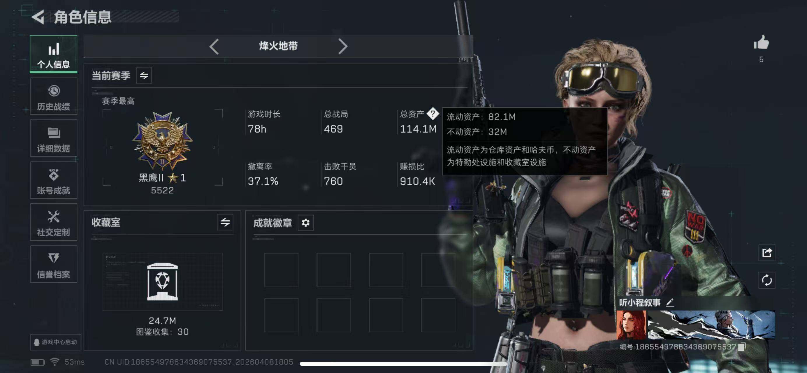 【SJ1705】114m总资产-338k哈夫币-60烽火等级-黑鹰-26战场等级-列兵