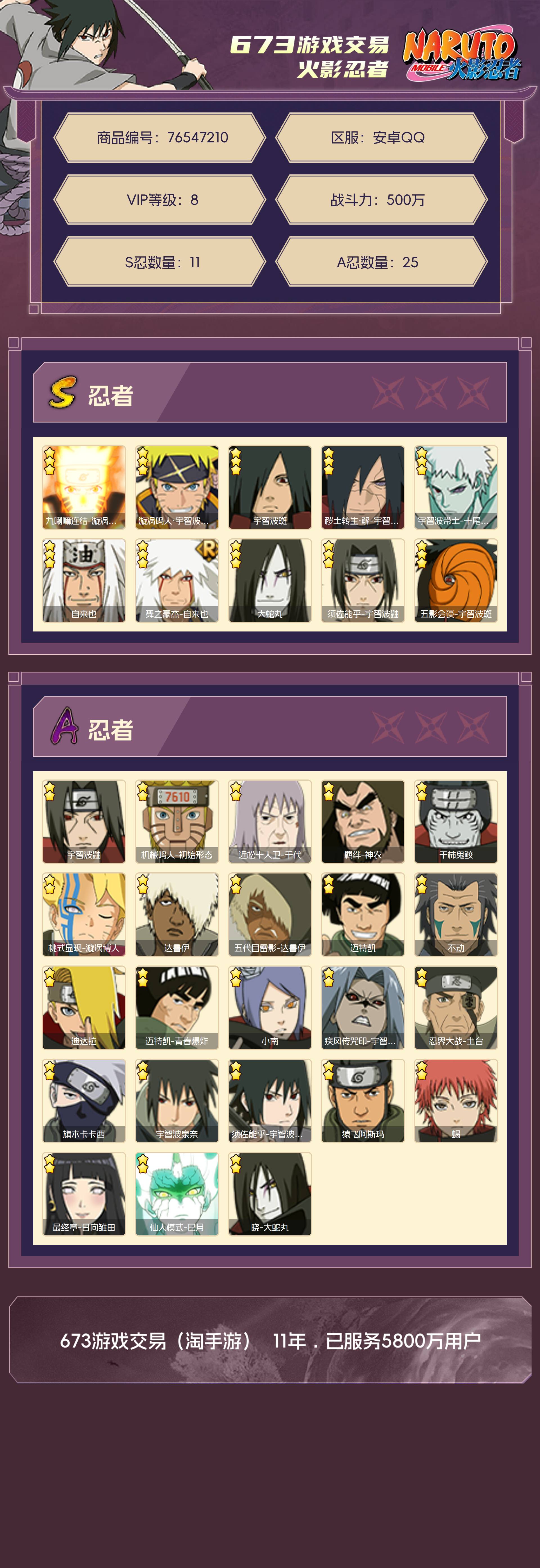 角色等级129 金币63 战斗力500万 S忍11 A忍25 8 段位影级