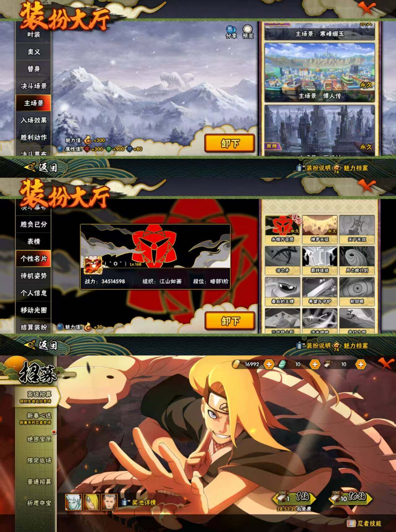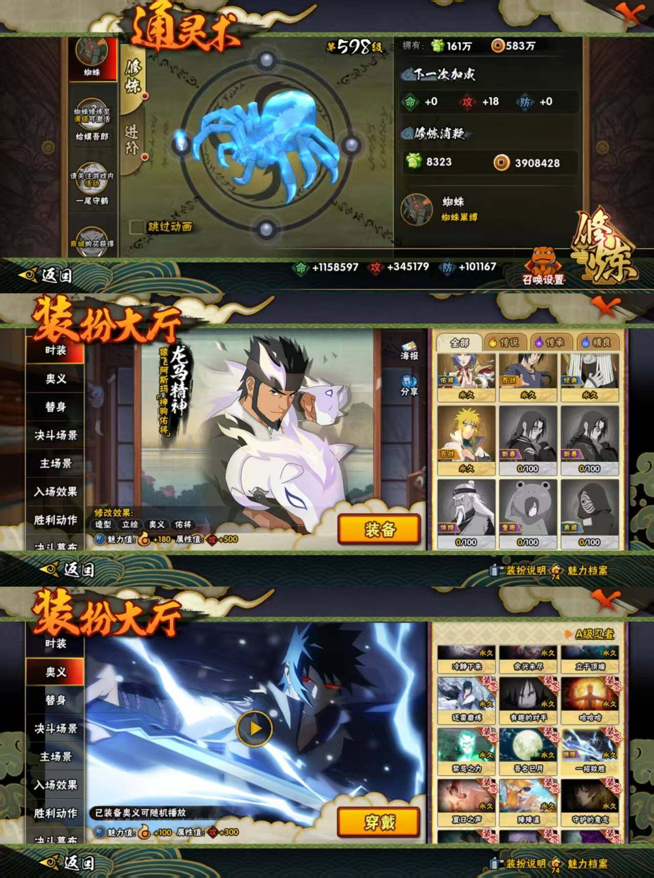 安卓Q区3451万战力充值3.1万本服15战区59战区一组全忍者37通灵藏管1570属攻带227万绿瓶74级魅力准全时装佐助168奥义3个主场景2张名片1.7万金币4个动态头像