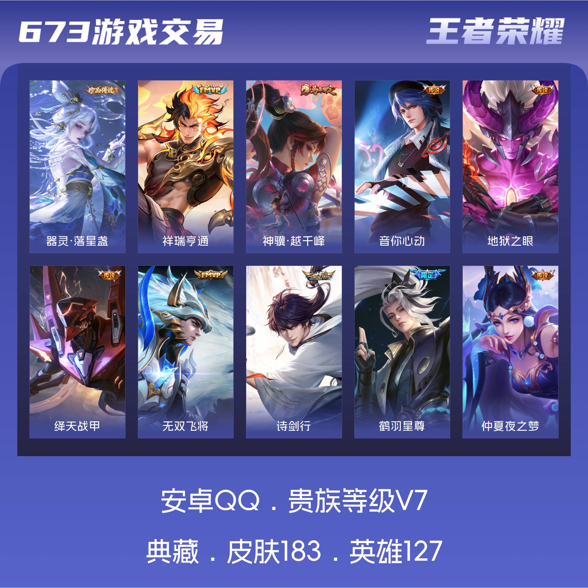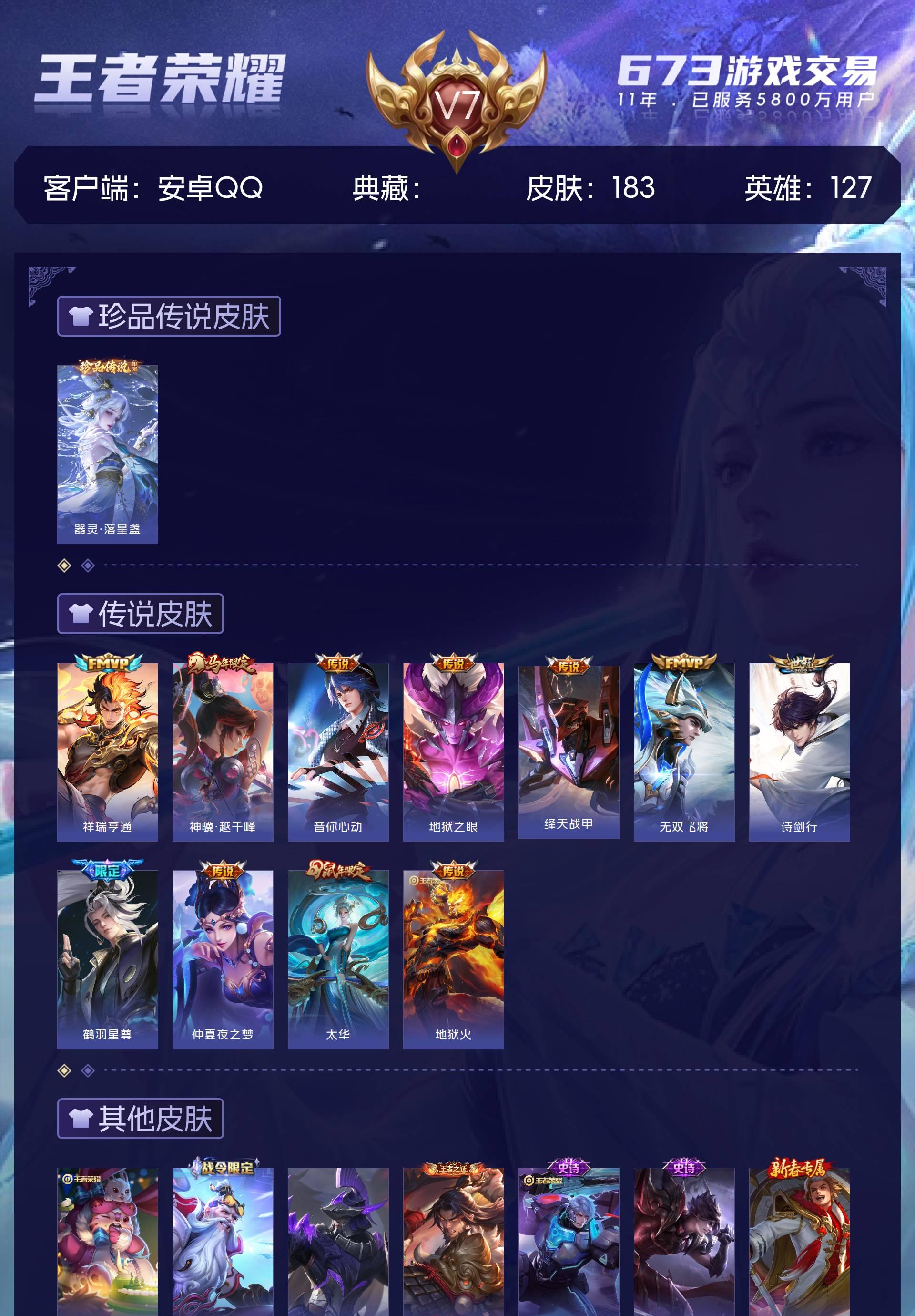 V7 皮肤183 英雄127 永恒钻石 珍品传说1 星传说2 传说11