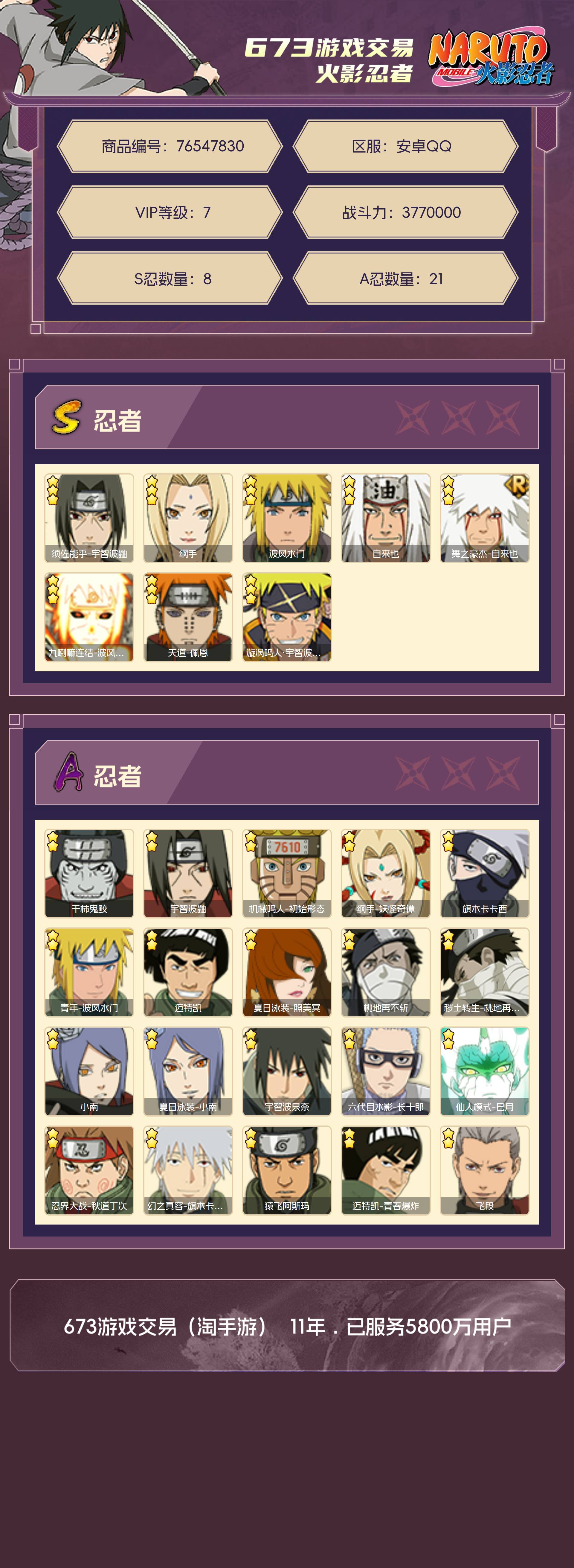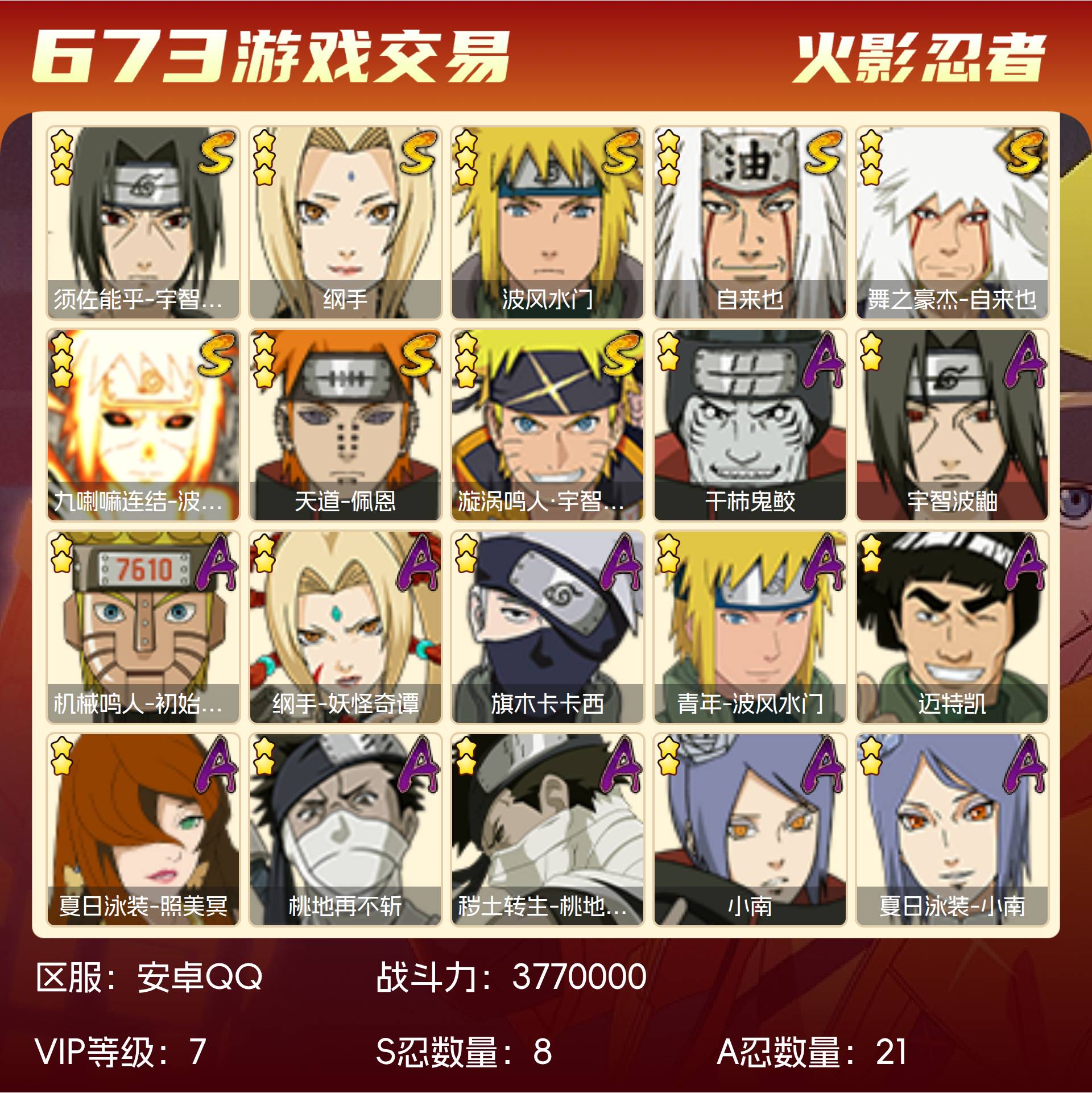 角色等级138 金币87 战斗力3770000 S忍8 A忍21 7 段位新生