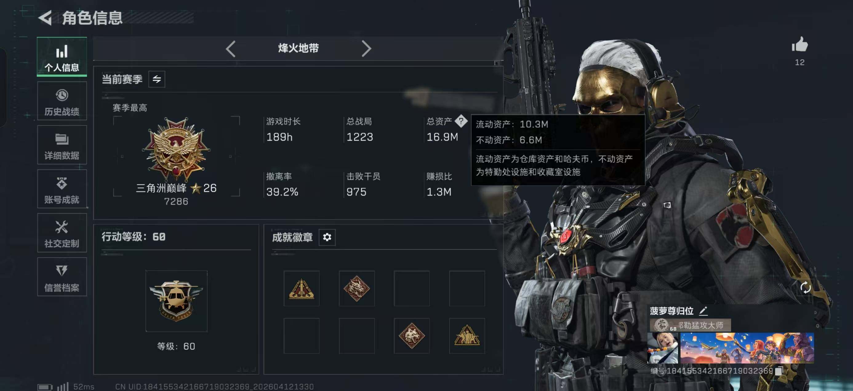 17m总资产-326k哈夫币-60烽火等级-三角洲巅峰-11战场等级-列兵