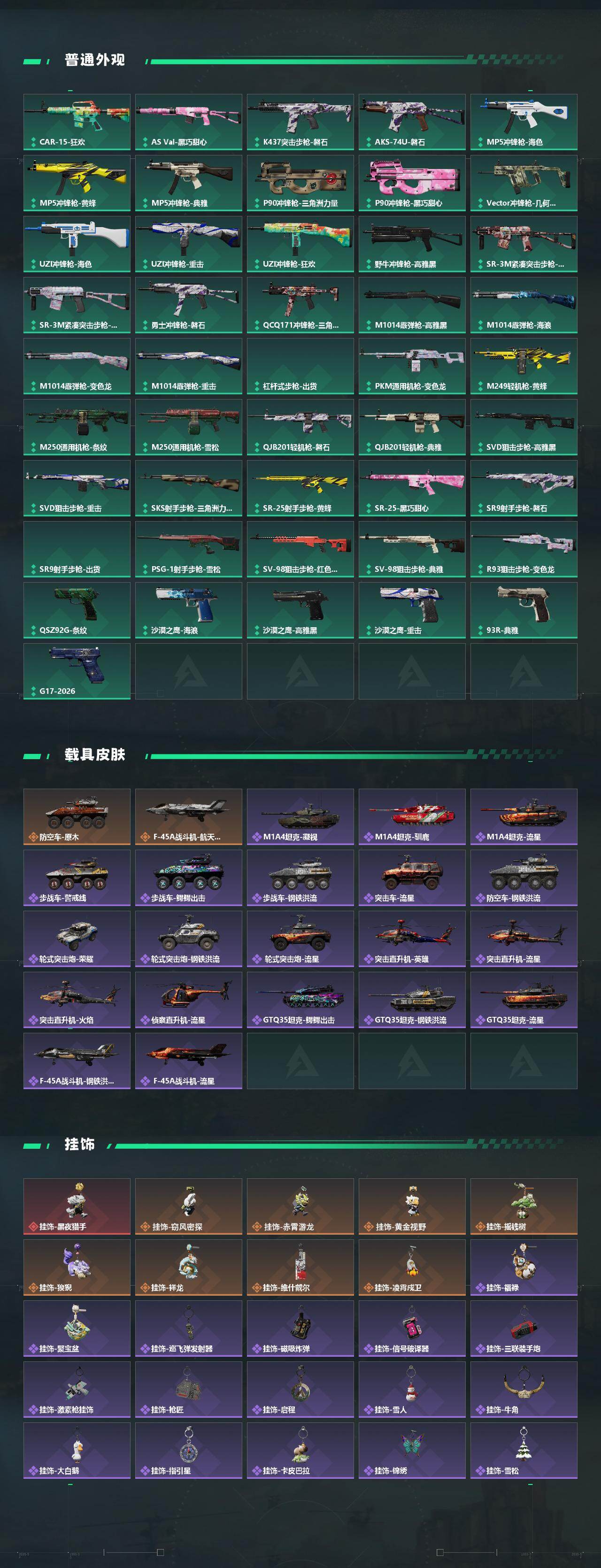 【传说外观】:M4A1突击步枪-蚀金玫瑰,AKM突击步枪-锦绣,ASh-12战斗步枪-鹅鸭杀,AUG突击步枪-悠然茶歇,SG552突击步枪-运动员,SCAR-H战斗步枪-启航,SCA