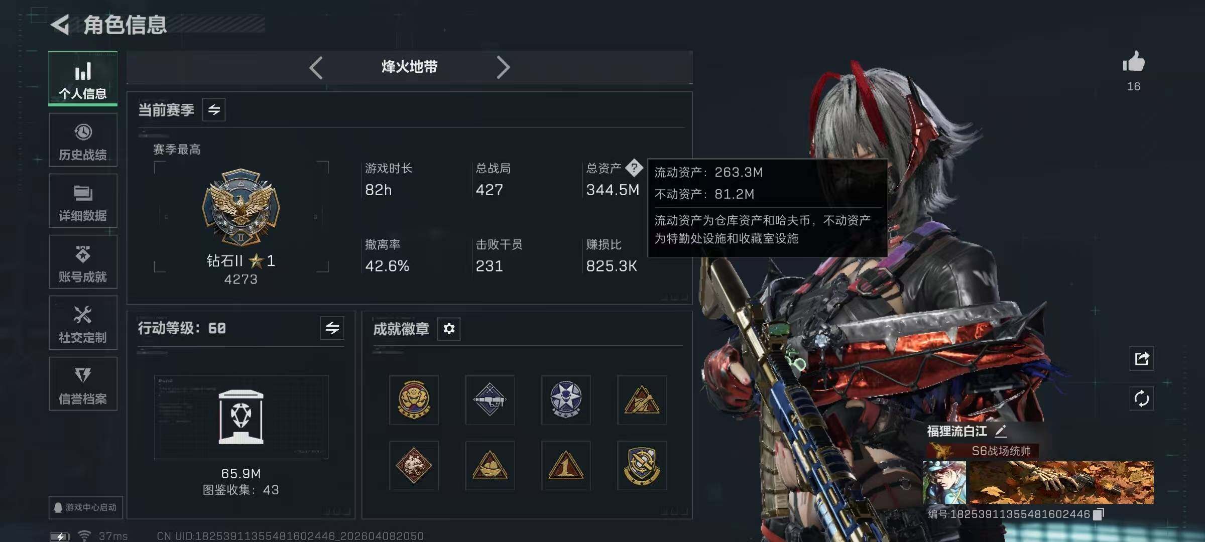 344m总资产-108459k哈夫币-60烽火等级-钻石-50战场等级-统帅