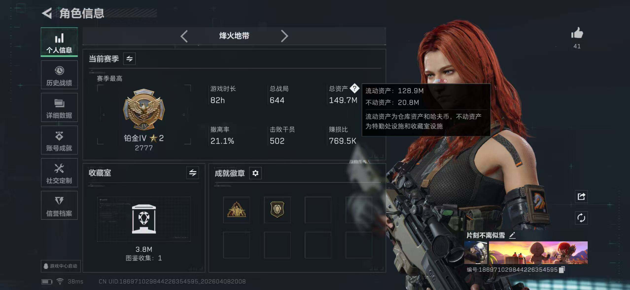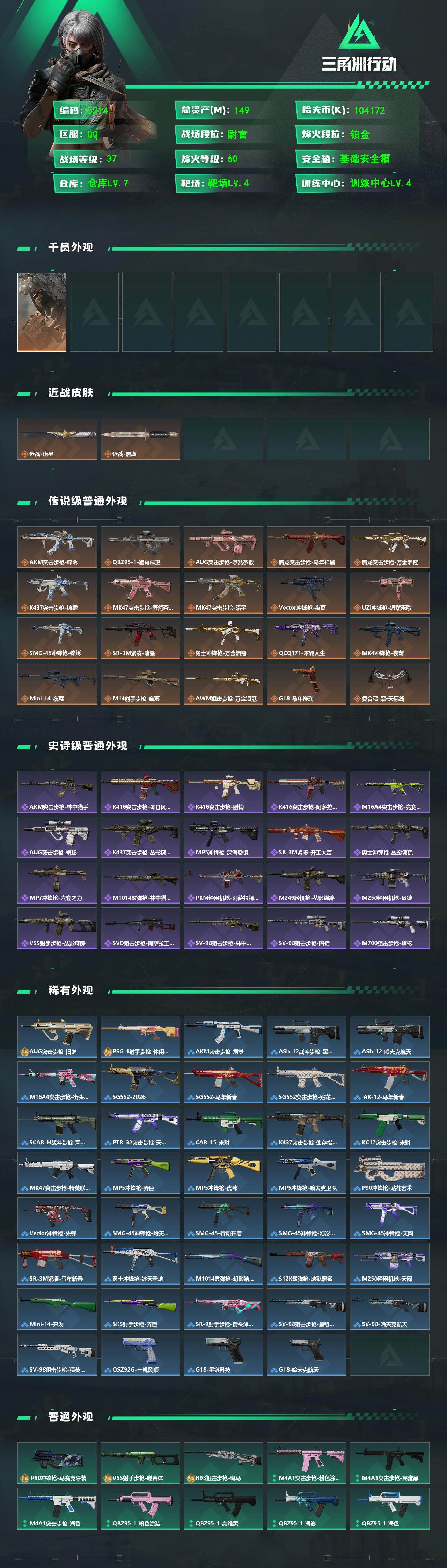 149m总资产100M纯币-104172k哈夫币-60烽火等级-铂金-37战场