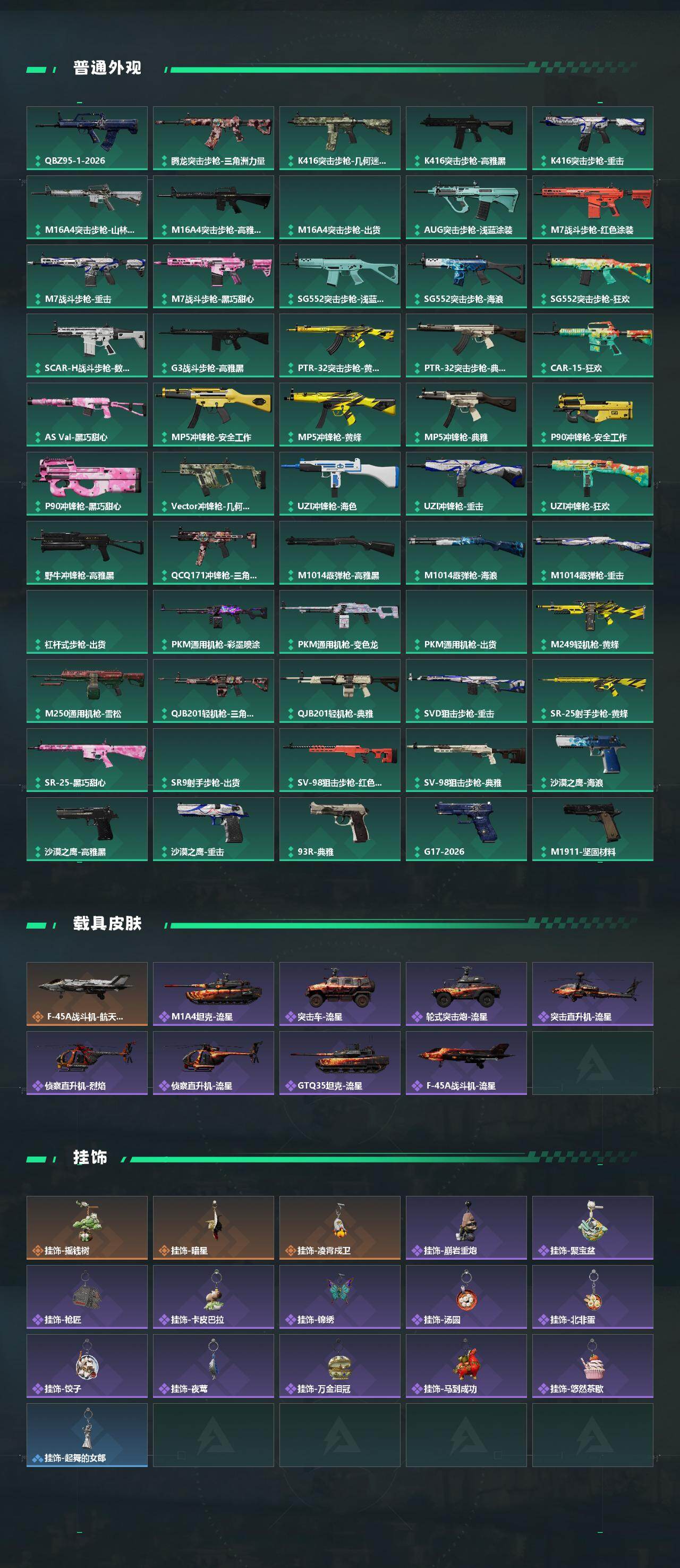 【传说外观】:AKM突击步枪-锦绣,QBZ95-1突击步枪-凌霄戍卫,AUG突击步枪-悠然茶歇,腾龙突击步枪-马年祥瑞,腾龙突击步枪-万金泪冠,K437突击步枪-锦绣,MK47突击步枪-悠然茶歇,MK47突击步枪-暗星,Vector冲锋枪