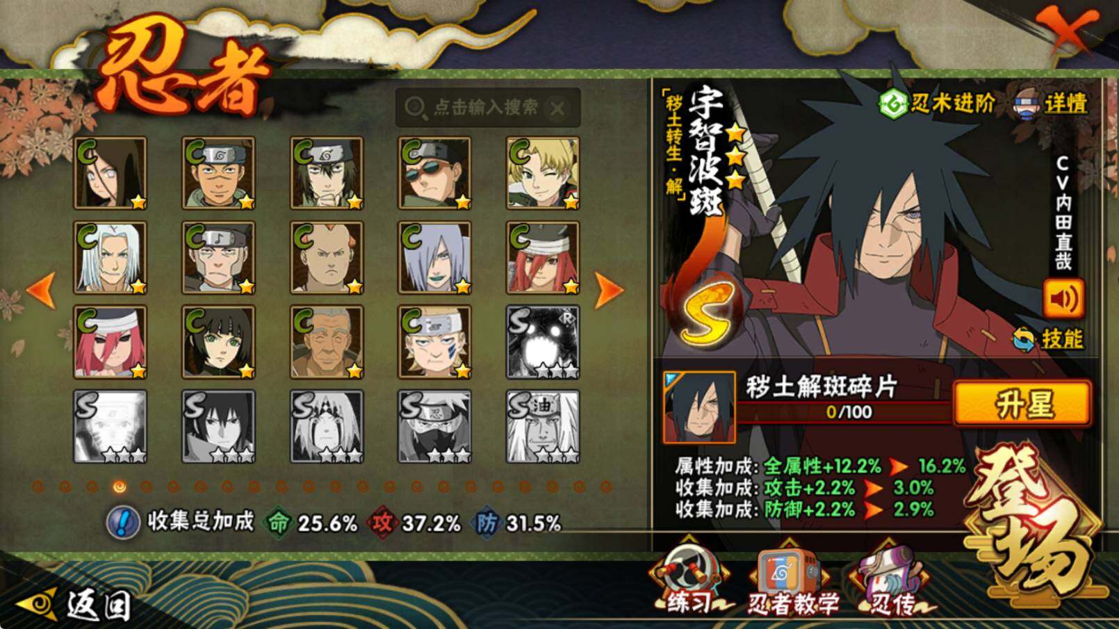 【S级忍者】:宇智波斑「秽土转生·解」(3星),宇智波鼬「须佐能乎」(3星),自来也「舞之豪杰」(3星),佩恩「天道」(3星),漩涡鸣人·宇智波佐助(3星)