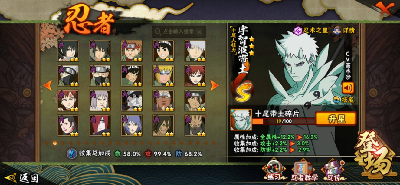 【S级忍者】旗木卡卡西「须佐能乎」(3星),自来也「传说中的三忍」(3星),漩涡鸣人「暴怒·第六尾」(3星),宇智波斑「秽土转生·解」(3星),大