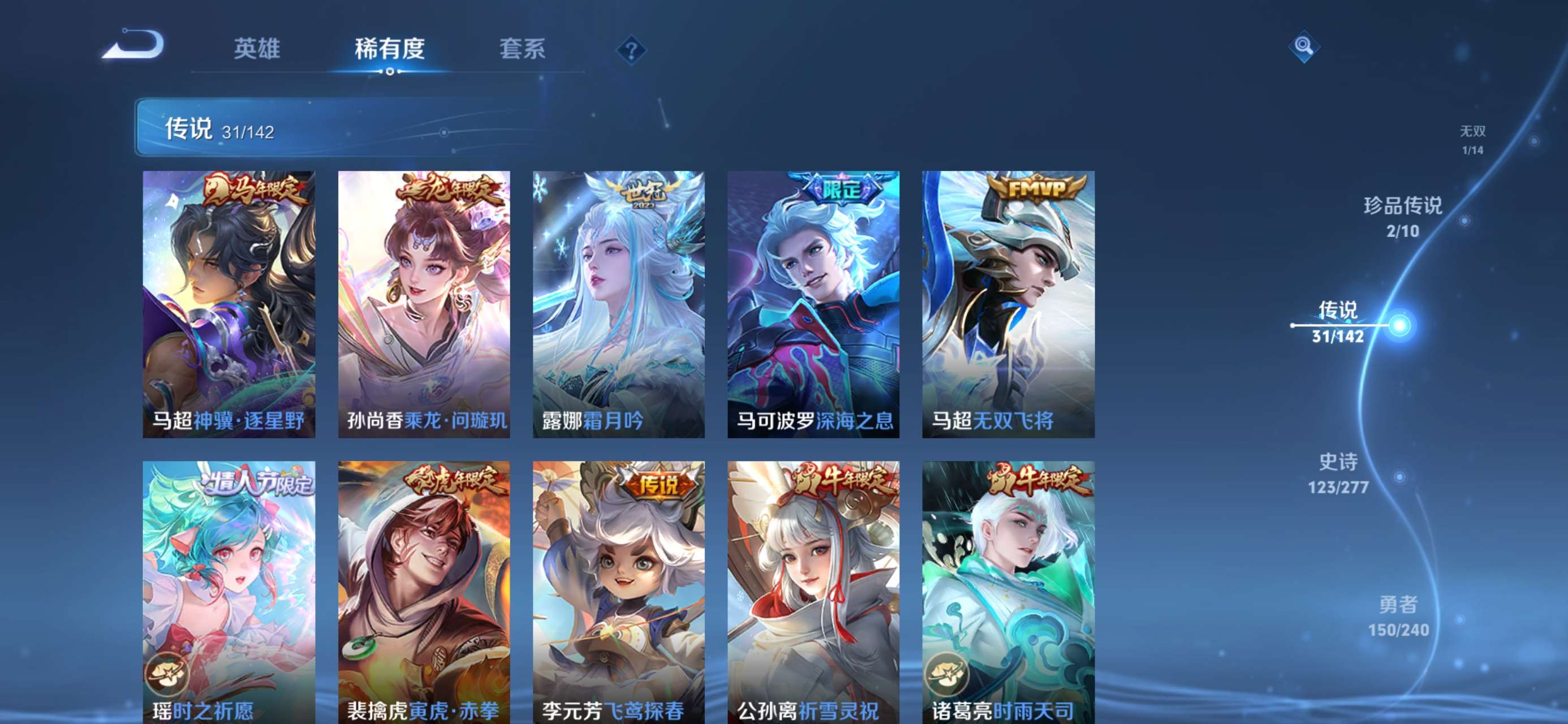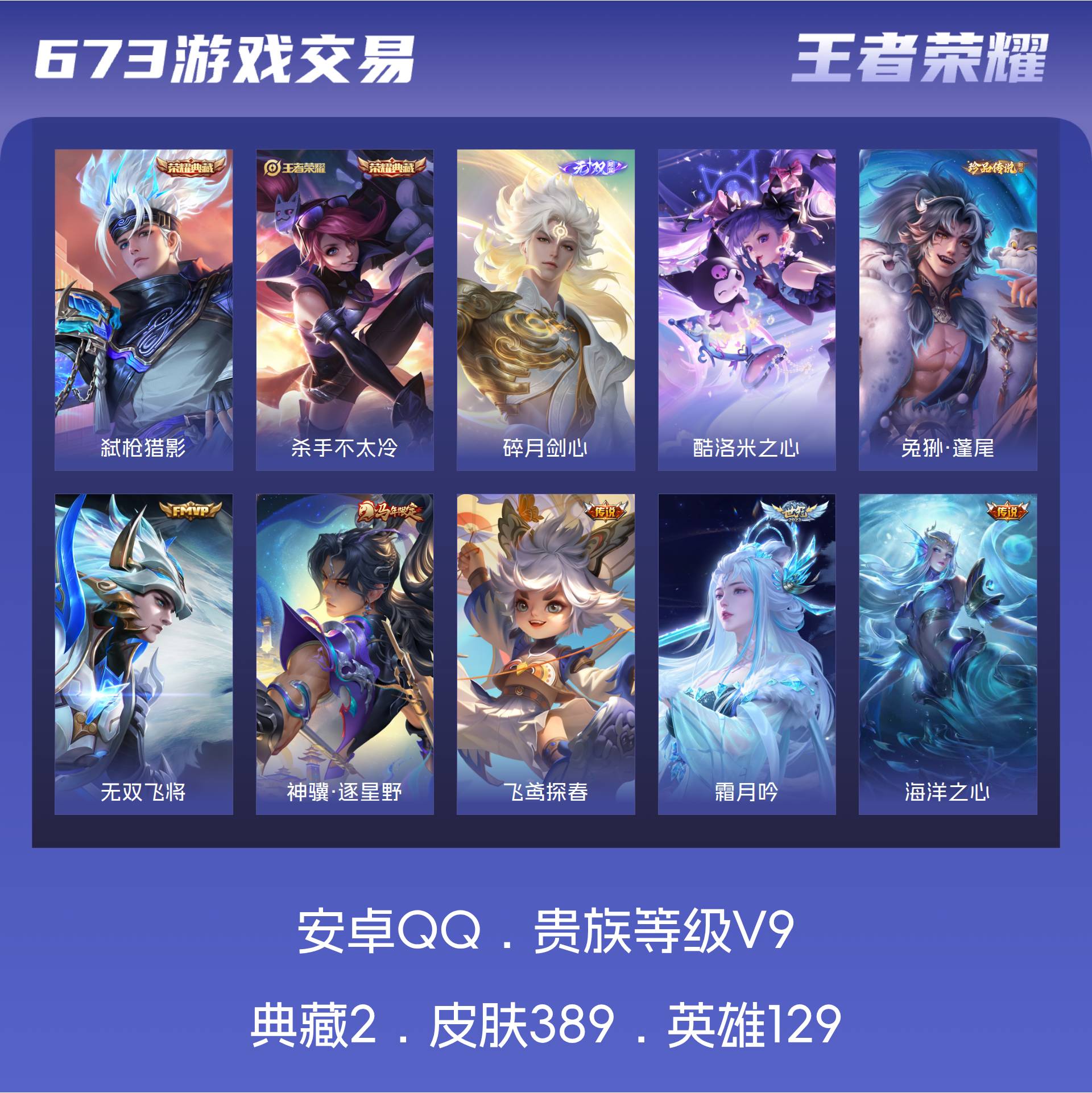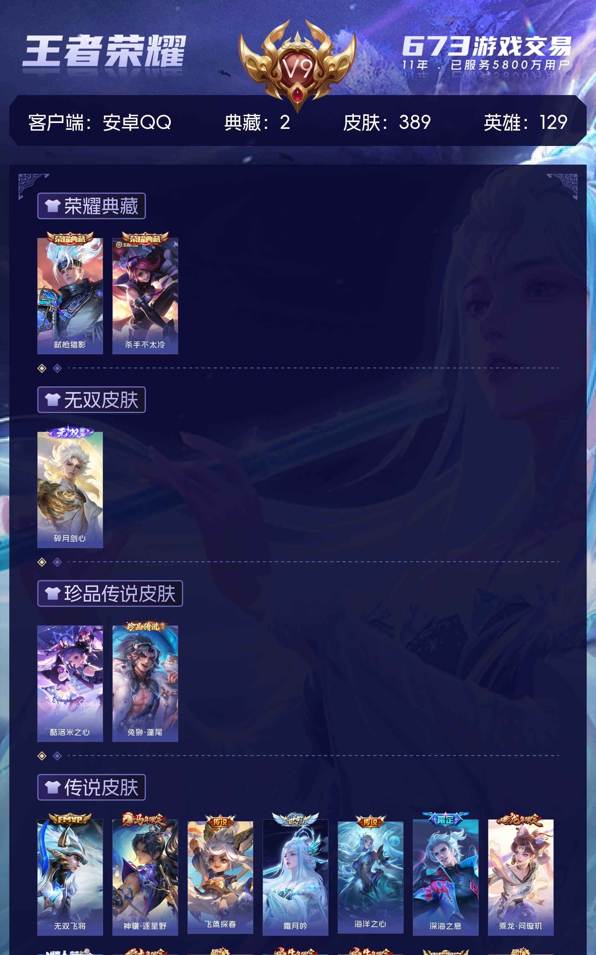 V9 皮肤389 英雄129 永恒钻石 荣耀典藏2 无双皮肤1 珍品传说2 传说31
