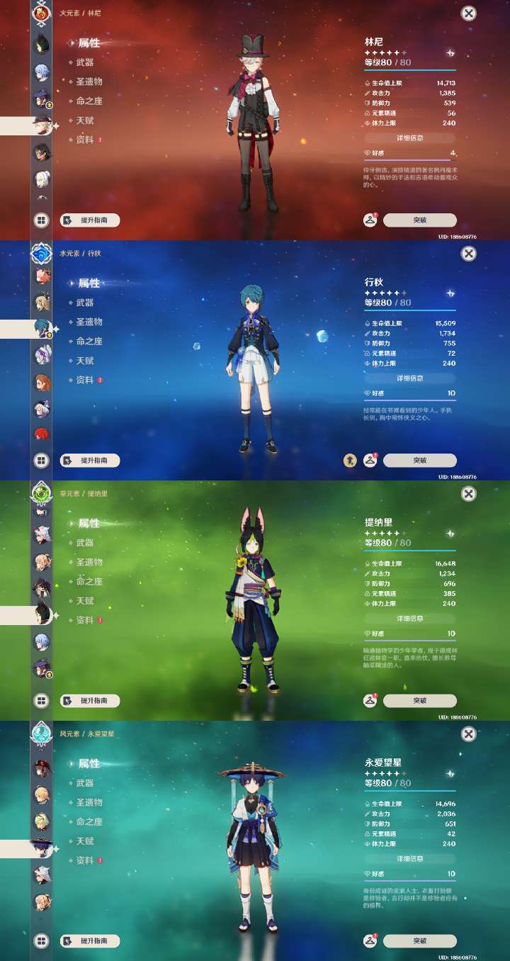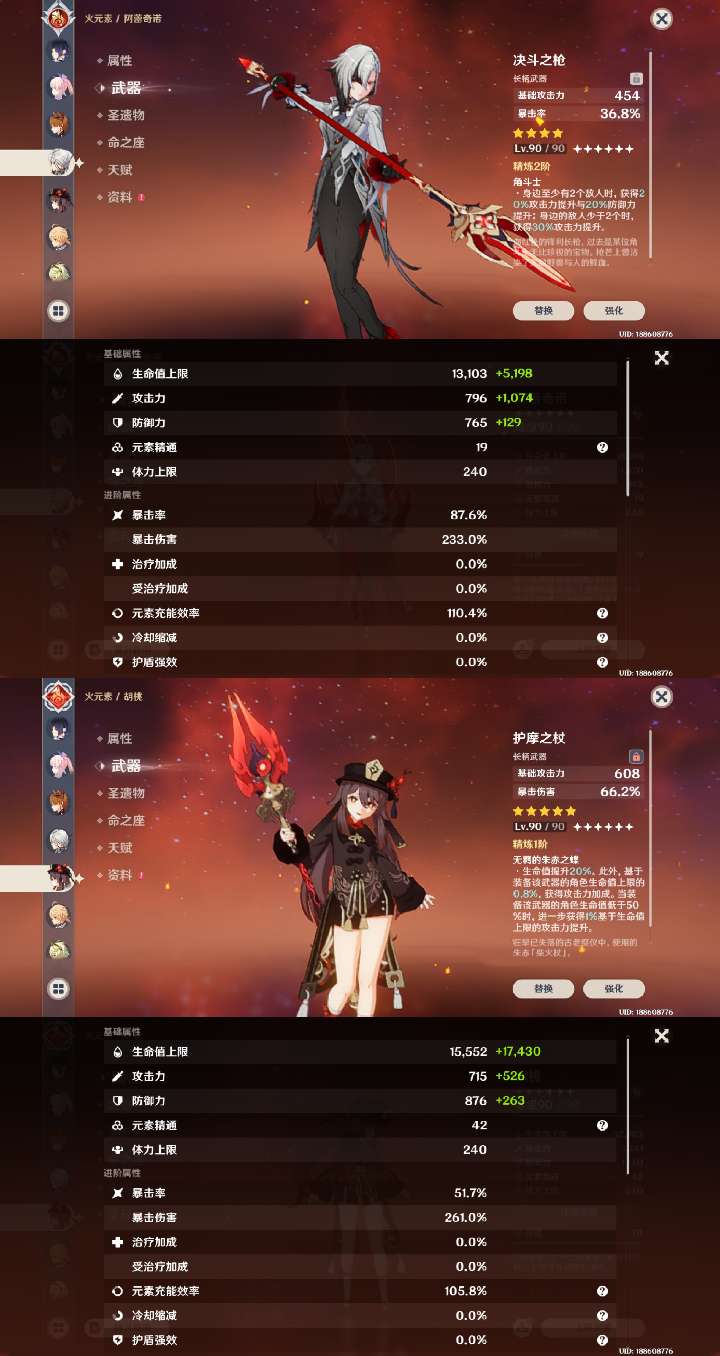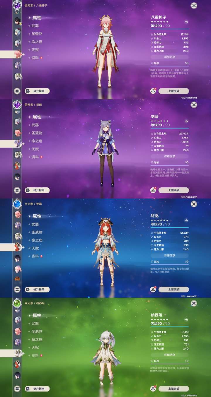 夜兰莱欧斯利1命带专武,胡桃公子带专武,神里绫华少女1命,号里专武很多,角色练度都很高,深渊随便打