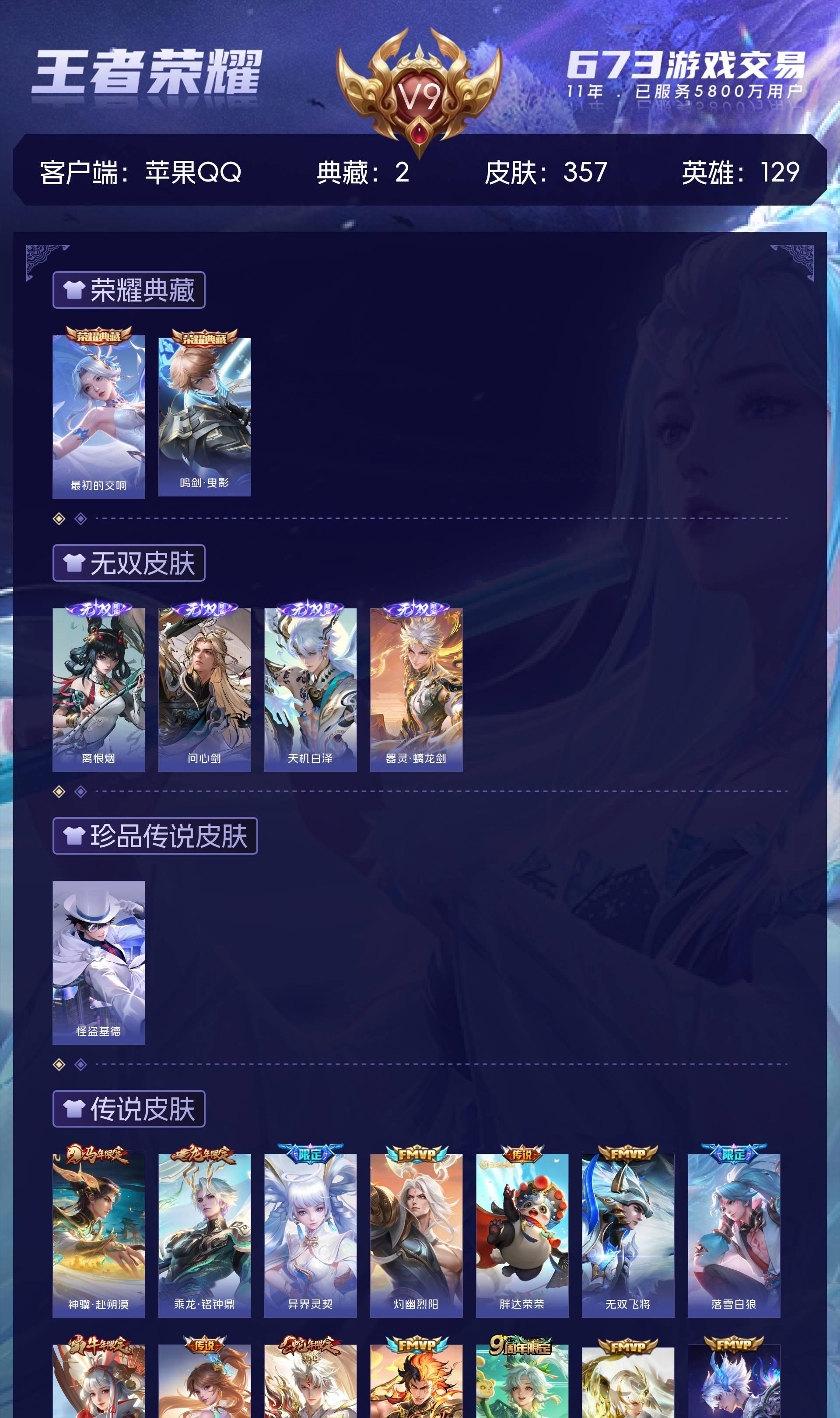 V9 皮肤357 英雄129 非凡王者 荣耀典藏2 无双皮肤4 珍品传说1 星传说3 传说29