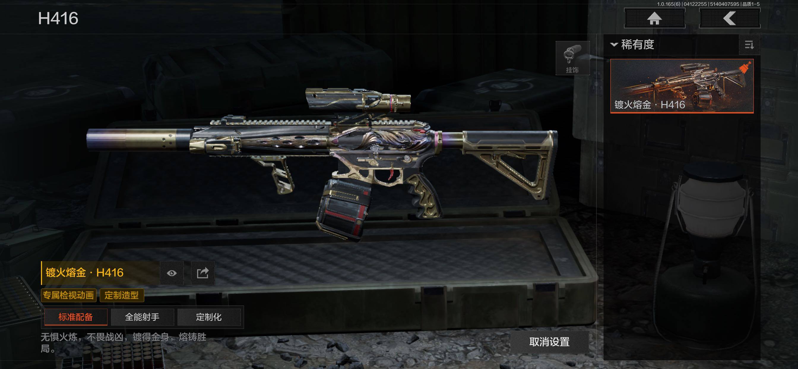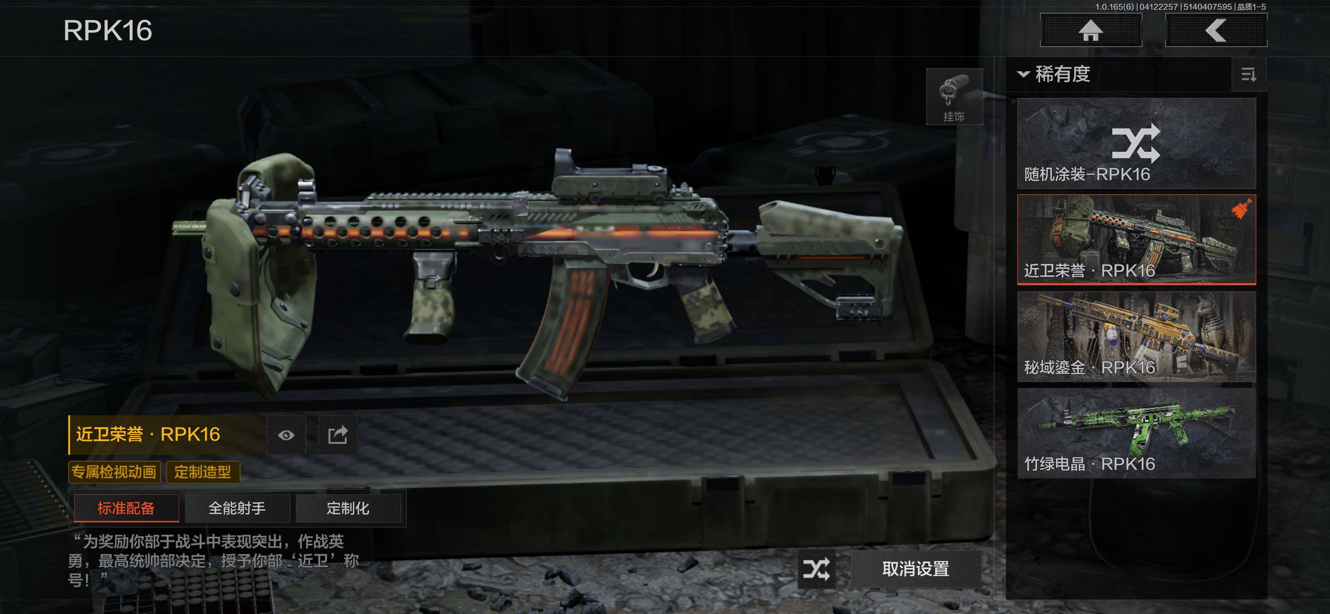 【金色枪皮】:包络战术AKM,近卫荣誉·RPK16,骑士之剑·VSS,旧王圣谕 ·VSS,利齿风暴·MPX,玉擎天工·MP5,旧王圣谕·QBZ191,战术大师·AN94,玉擎天工·AN94,战术大师·A