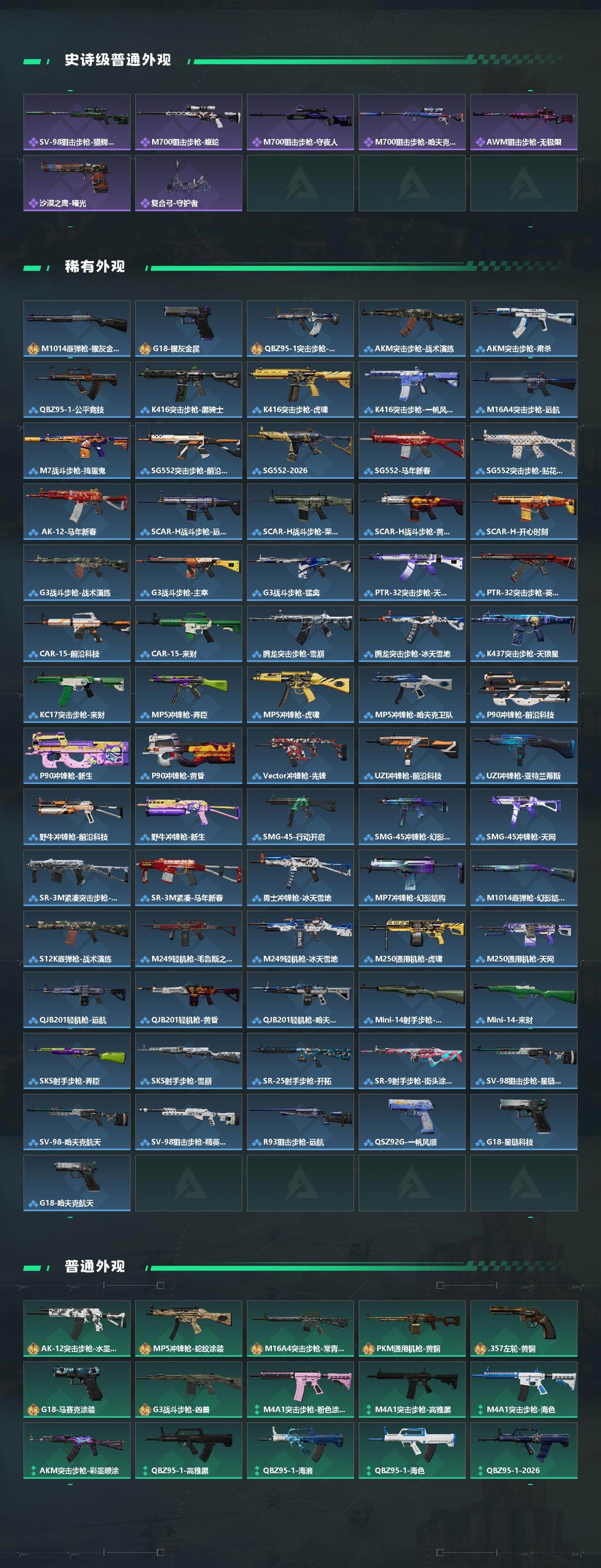【传说外观】:M4A1突击步枪-蚀金玫瑰,M4A1突击步枪-阿米娅,ASh-12战斗步枪-鹅鸭杀,K416突击步枪-行动记录,AUG突