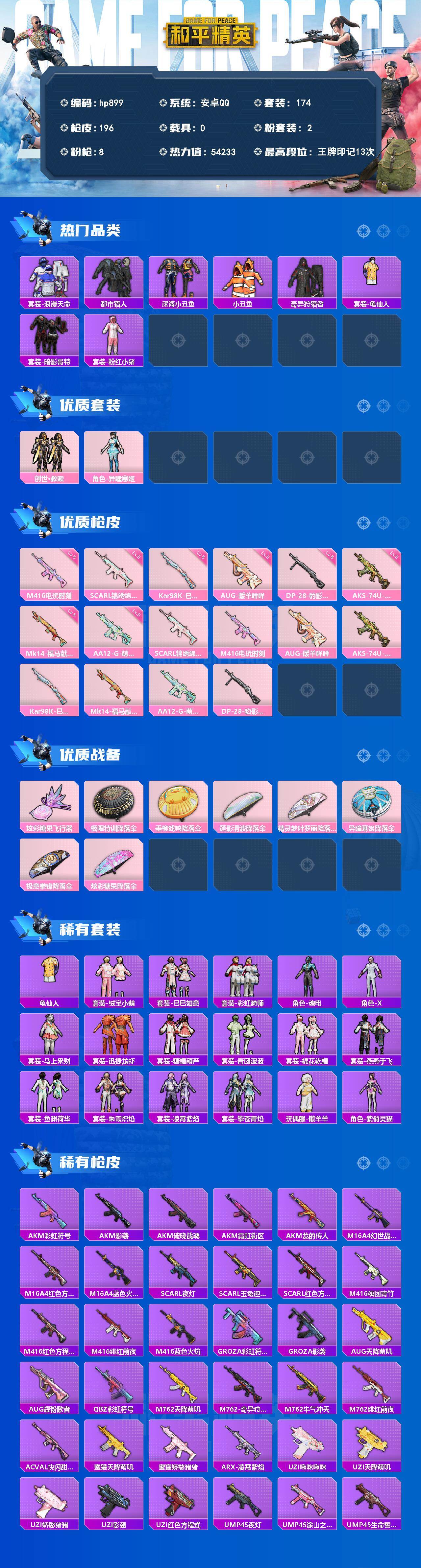 安卓 手Q-2粉装-8特效枪-0载具-1粉色飞行器-54233热力值-13王牌印记-174套装-196枪皮