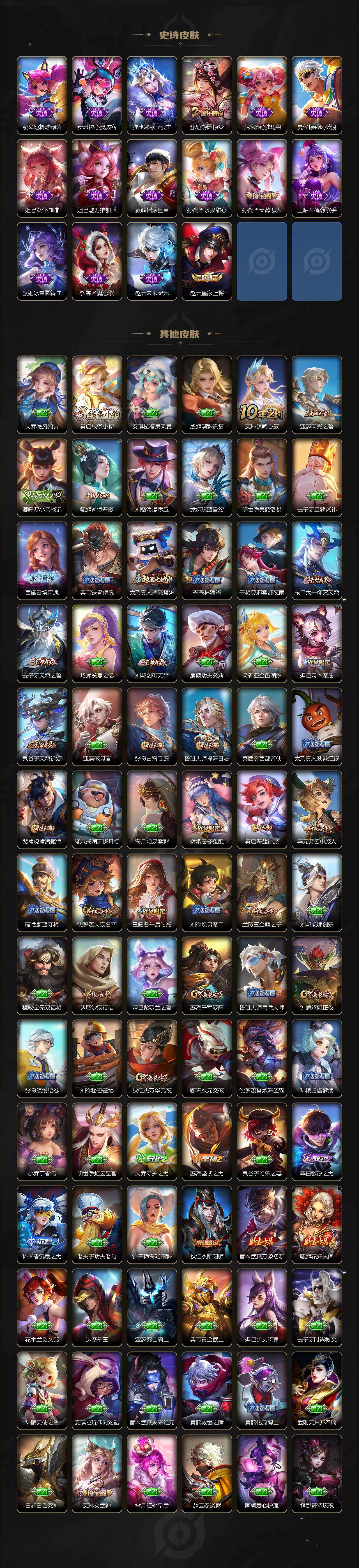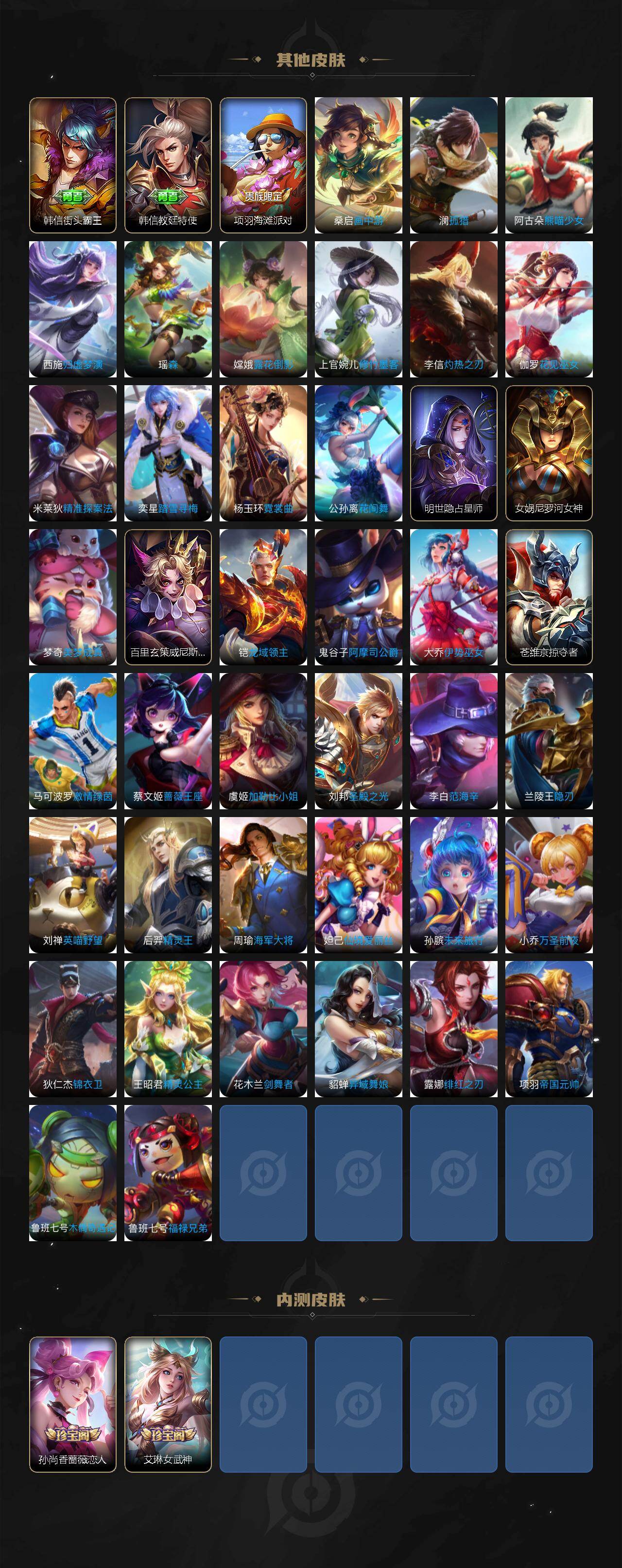【限定皮肤】:姜子牙天穹之誓,狄仁杰阴阳师,小乔山海琳琅生,赵云皇家上将,孙尚香蔷薇恋人,庄周高山流水,元歌无心,甄姬游园惊梦,狄仁杰万华元夜,达摩沙漠行僧,项羽海滩派对,王昭君午后时光,兰陵王金庭之子,李元芳云中